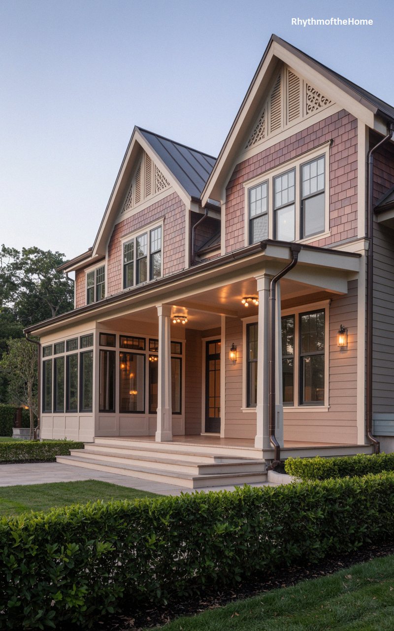 Exuding a warm, inviting aura, this elegant residence is painted in a muted dusty rose, accented heavily by delightful fish-scale shingles nestled within the steep front gables. The home’s true centerpiece is its sprawling, deep front porch, supported by sturdy white columns and partially enclosed by massive black-framed glass panels to create a magnificent sunroom. As dusk settles, warm, amber light spills from vintage-inspired fixtures under the porch ceiling and from within the home, highlighting the dark standing-seam metal roof. Neatly manicured, dense boxwood hedges border the pristine concrete walkway, completing a picture of refined suburban tranquility.