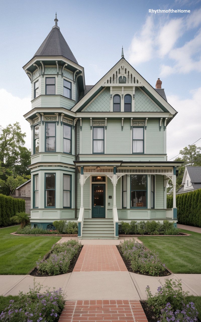 Looking as though it was plucked from a fairy tale, this spectacular home features a pale mint green facade beautifully contrasted by deep teal window frames and trim. An imposing three-story octagonal tower dominates the left side, crowned with a flared conical roof and a delicate finial. The front gable is adorned with breathtakingly intricate bargeboard and gingerbread cutouts, showcasing the pinnacle of Victorian carpentry. A highly detailed, spindled porch wraps welcomingly around the ground floor. The approach is made via a classic, perfectly laid red brick pathway, bordered by vibrant green lawns and subtle floral plantings.