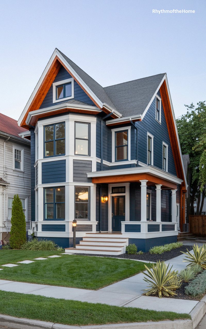 Bold color blocking defines this striking urban residence. The exterior is enveloped in a deep, rich navy blue siding, which makes the vibrant, honey-orange stained wood of the roof overhangs and porch structure absolutely pop. Thick, crisp white trim beautifully delineates the complex geometry, particularly highlighting the stacked, multi-story bay window that pushes outward to capture light. The sturdy front porch features robust white columns supporting the warm wooden roof structure above. Modern landscaping, utilizing a mix of large concrete pavers, dark mulch, and spiky architectural plants, grounds this vivid, contemporary take on a historic silhouette.