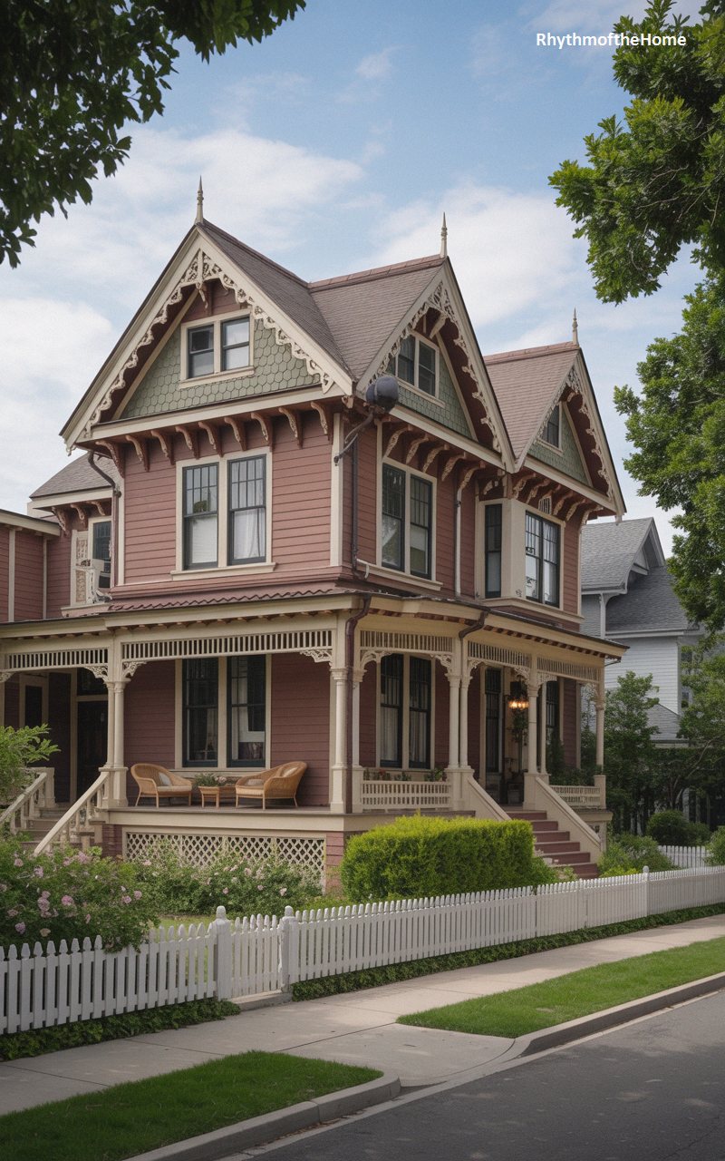 A masterclass in Victorian ornamentation, this exquisite home boasts a dusky mauve exterior heavily accented by pale sage green fish-scale shingles in its steep, dual front gables. The defining feature is the breathtaking array of delicate, cream-colored gingerbread trim dripping from the eaves and bordering the sweeping wraparound porch. Ornate brackets, spindled railings, and intricately carved details create a lace-like effect across the entire facade. Twin wicker chairs invite relaxation on the deep porch. A charming, scalloped white picket fence borders the property, enclosing blooming bushes and completing the idyllic, historically faithful, and utterly romantic aesthetic.