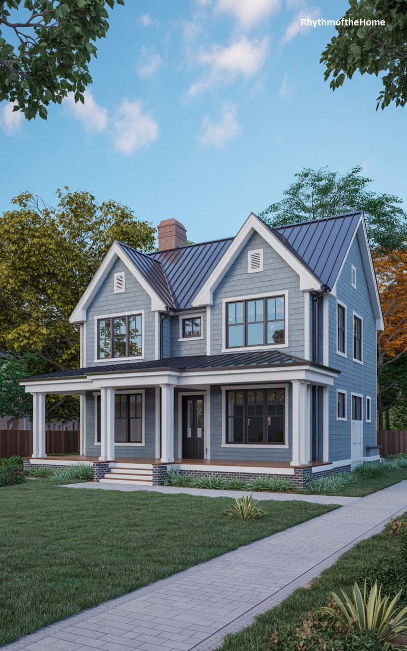 Presenting a slightly more robust and grounded take on the style, this home utilizes a lovely slate blue-grey shingle exterior paired with a sleek, dark grey standing-seam metal roof. The architecture features prominent, intersecting steep gables adorned with subtle vent details. A deep, welcoming front porch spans the width of the main structure, supported by beautifully substantial, classic white columns and a sturdy, plain white railing. Black window casings provide a modern contrast against the cool-toned siding. A pristine, flawlessly manicured lawn and a clean, wide paved walkway lead to the charming brick-skirted entrance.