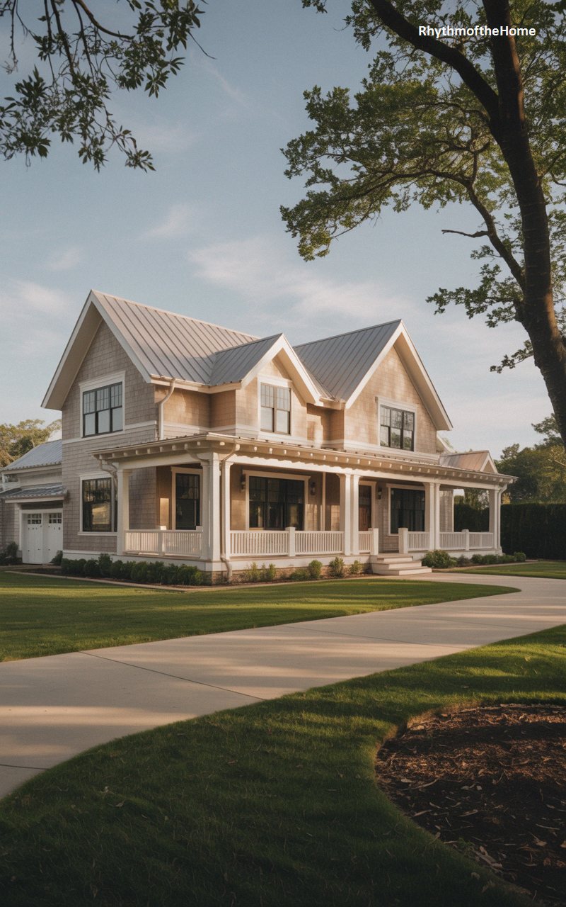 Bathed in the soft, golden light of late afternoon, this expansive home exudes peaceful suburban grandeur. Clad entirely in delicate, light grey cedar-style shingles, the exterior is unified and elegant. A magnificent, deep wraparound porch is the focal point, featuring exposed wooden rafters, thick white columns, and a traditional spindled railing, promising endless relaxing summer evenings. The complex, steeply pitched metal roofline adds architectural interest without overwhelming the serene facade. A massive, mature tree frames the right side of the composition, casting long, dramatic shadows across the vast, beautifully maintained green lawn and the sweeping curved driveway.