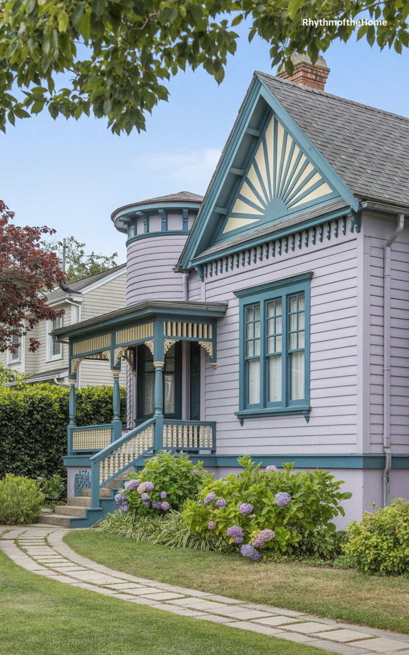 Delightfully whimsical, this charming cottage-scale home is painted in a beautiful, soft lavender hue. It is spectacularly accented by a vivid teal and cream sunburst design radiating from the main front gable, a cheerful hallmark of the era’s decorative exuberance. Teal trim outlines the windows and the delicate, turned posts of the small but intricate front porch. A subtle, cylindrical tower structure blends seamlessly into the left side of the facade. The romantic aesthetic is perfectly complemented by lush, blooming bushes of purple and blue hydrangeas that spill over the foundation near the quaint flagstone pathway.