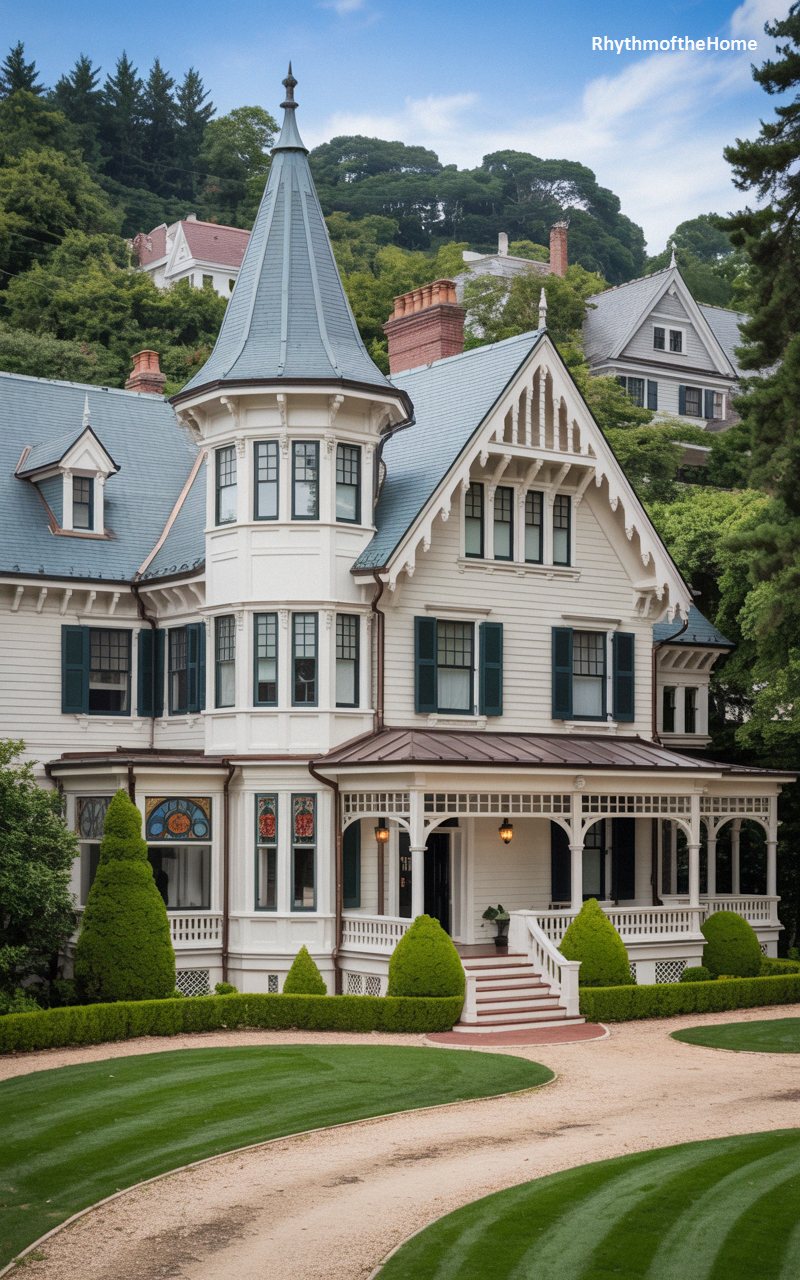 Nestled gracefully against a lush, forested hillside, this grand estate features a pristine white shiplap exterior accented by elegant, dark forest-green traditional window shutters. The complex, asymmetrical roofline is clad in a beautiful grey-blue slate and dominated by a central, multi-sided turret with a flared roof. A breathtaking, colorful stained-glass window is proudly displayed on the ground floor, hinting at the opulent historic details within. The sprawling, highly detailed front porch boasts delicate spindle-work and a wide, welcoming staircase. Flawlessly manicured conical evergreen shrubs line the sweeping, curved driveway, enhancing the home’s highly aristocratic presence.