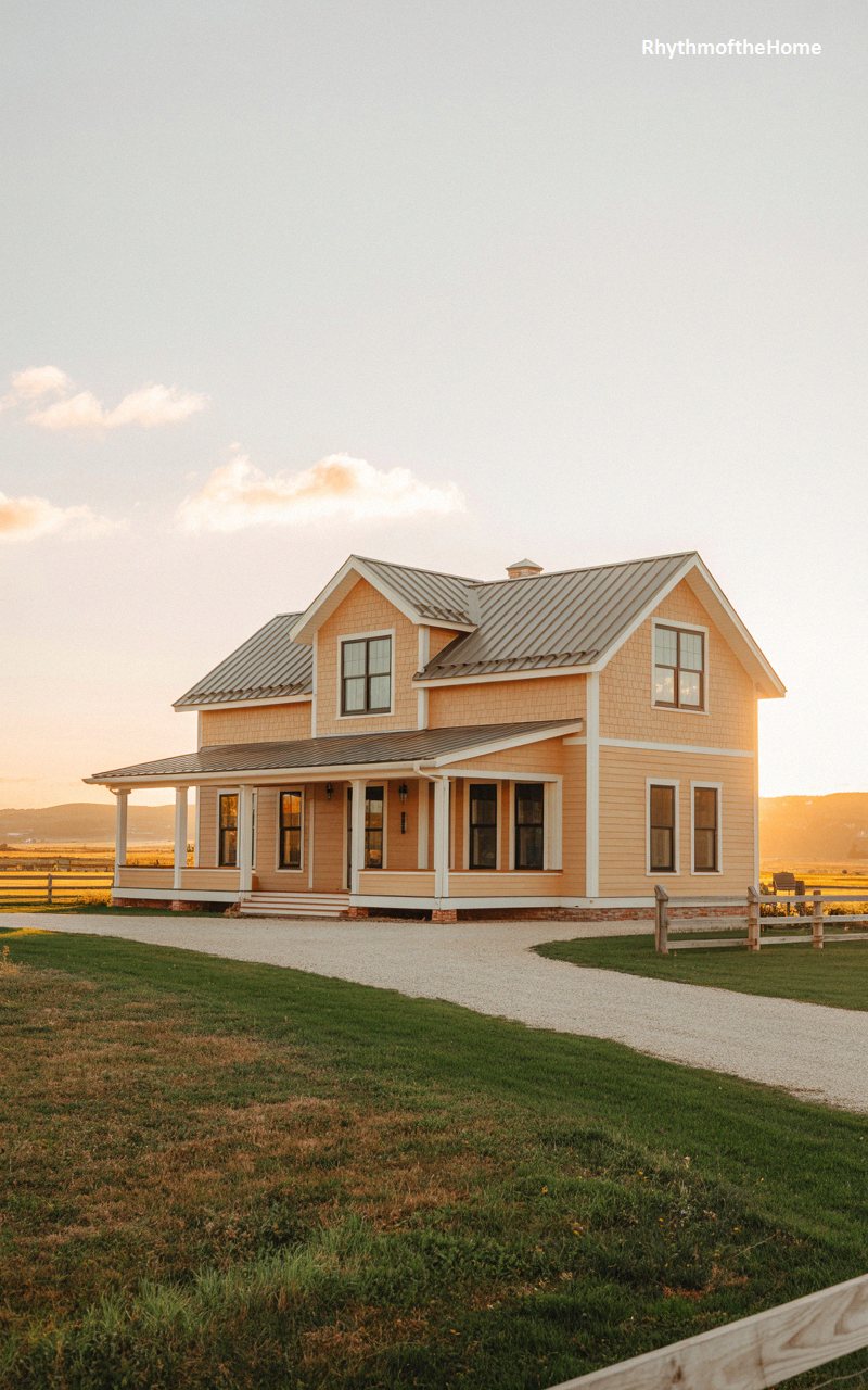 Bathed in the radiant, warm glow of a setting sun, this charming home effortlessly blends Victorian verticality with classic farmhouse simplicity. Painted in a soft, buttery yellow, the siding features subtle textural shifts in the prominent front gables. A durable, dark metal roof caps the steep pitches. The wide, inviting front porch is supported by clean white columns and lacks the heavy ornamentation typical of the era, offering a breezy, relaxed feel. Set against a backdrop of open fields and rolling hills under a spectacular sunset sky, the property evokes a profound sense of rural tranquility.
