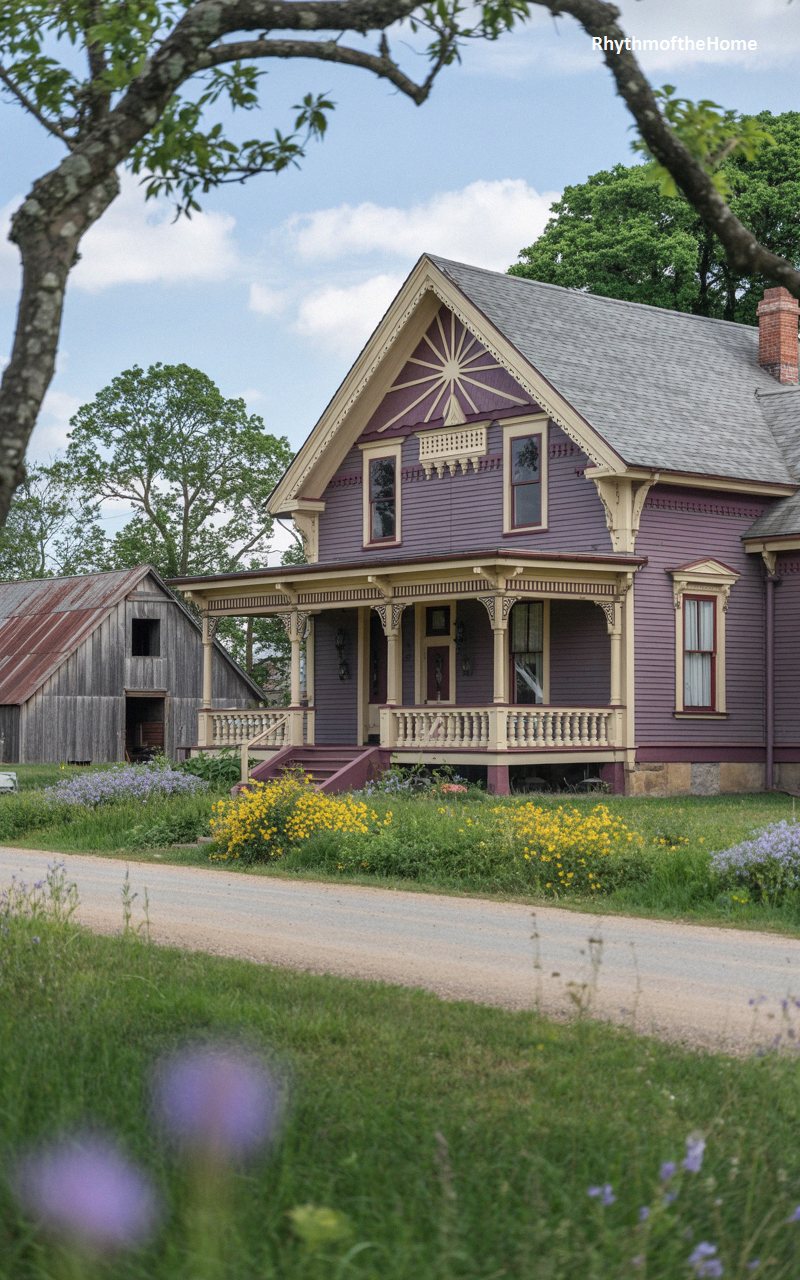 Bursting with personality, this vibrant country home features a striking, deep plum-purple exterior beautifully offset by buttery yellow trim. A large, intricate sunburst carving decorates the main front gable, accompanied by delicate, lace-like fretwork along the eaves. The highly detailed porch boasts beautifully turned columns and spindled railings, demonstrating classic Victorian craftsmanship. Interestingly, this ornate residence sits adjacent to a heavily weathered, rustic wooden barn with a rusty corrugated roof, creating a fascinating contrast between refined historical architecture and rugged agricultural utility. A dirt country road and wildflowers complete this uniquely charming rural vignette.
