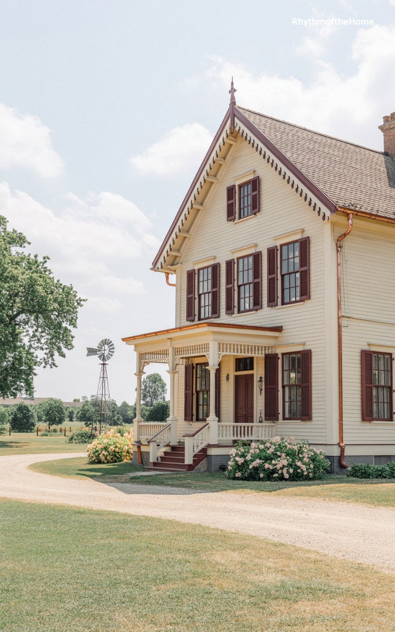 A picture of classic Americana, this elegant home features a pale, creamy yellow facade accented by dark, rich maroon window casings, trim, and functional shutters. Delicate, meticulously carved gingerbread trim outlines the steep front gable, adding a touch of refined lace to the roofline. The welcoming front porch boasts beautiful woodwork, leading to a stately dark wood entry door. Beyond the manicured gravel driveway and blooming rose bushes, a quintessential vintage metal windmill towers over the distant pasture, firmly rooting this beautiful, historically detailed home in its romanticized, pastoral countryside setting.