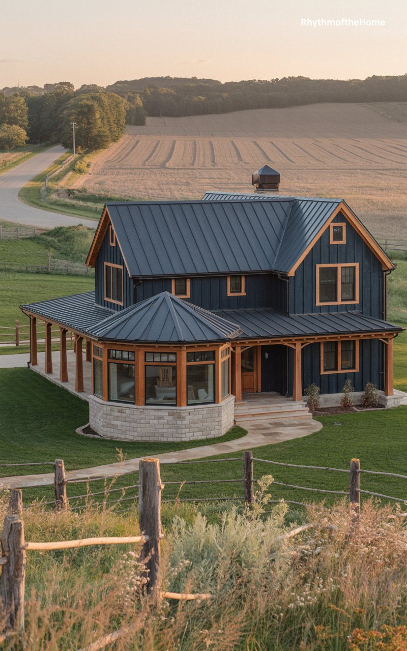Perched majestically above rolling, plowed farmlands, this striking modern interpretation commands attention. The exterior is clad in deep, dramatic charcoal-blue siding, sharply contrasted by vibrant, natural wood trim around the windows and framing the expansive porch. A massive, multi-sided sunroom extension dominates the left side, featuring a low-pitched metal roof and resting on a sturdy foundation of light-colored stone. The main structure features the classic, steeply pitched gables characteristic of the style, all covered by a sleek black metal roof. A rustic wooden fence in the foreground perfectly frames this bold, luxurious country estate.