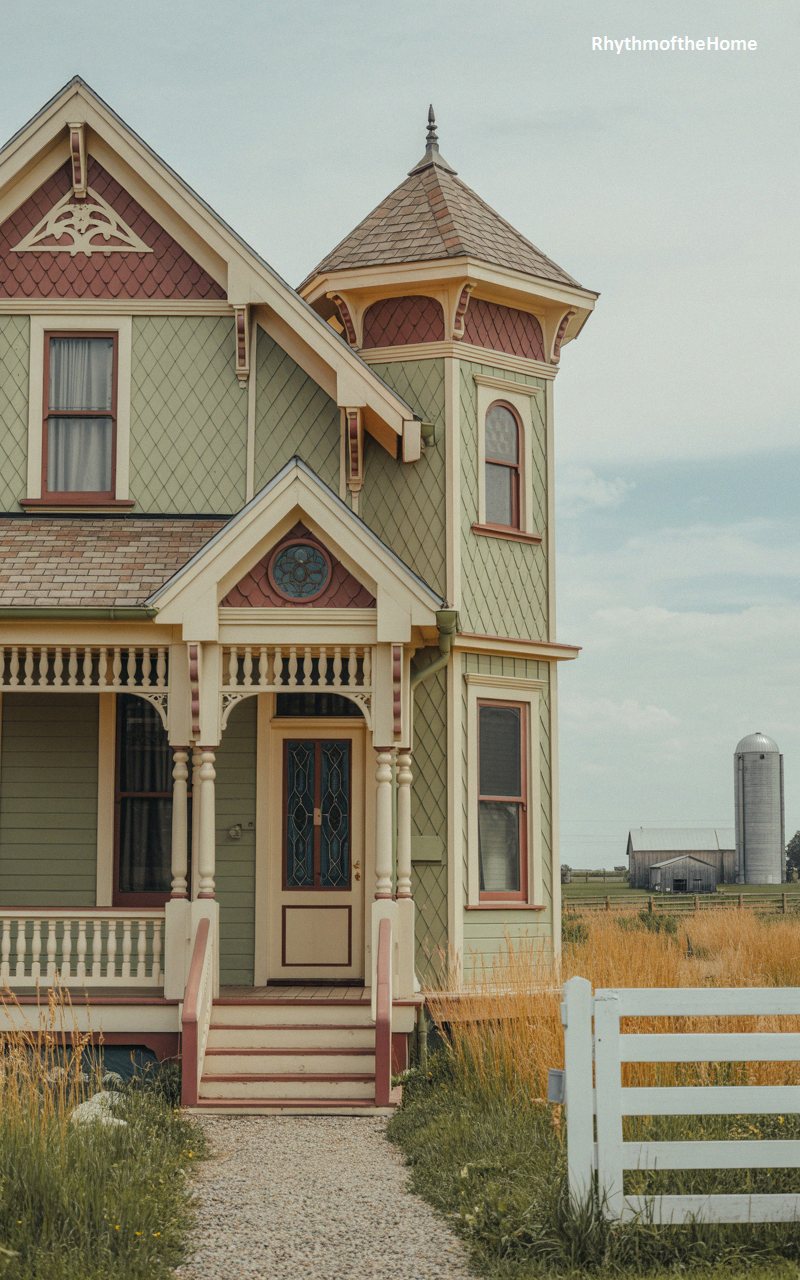 Nestled against an idyllic rural backdrop complete with a traditional silo, this enchanting residence beautifully marries intricate Victorian details with rustic charm. The facade features soft sage green siding contrasted by striking burgundy fish-scale shingles in the gables and turret. A welcoming front porch boasts delicate cream-colored spindle work, drawing the eye toward a handsome door adorned with historic stained glass. The hexagonal corner tower features small arched windows, adding a whimsical touch. Approached by a simple gravel path framed by tall grasses and a quintessential white wooden fence, this home offers a tranquil, historically rich countryside escape.