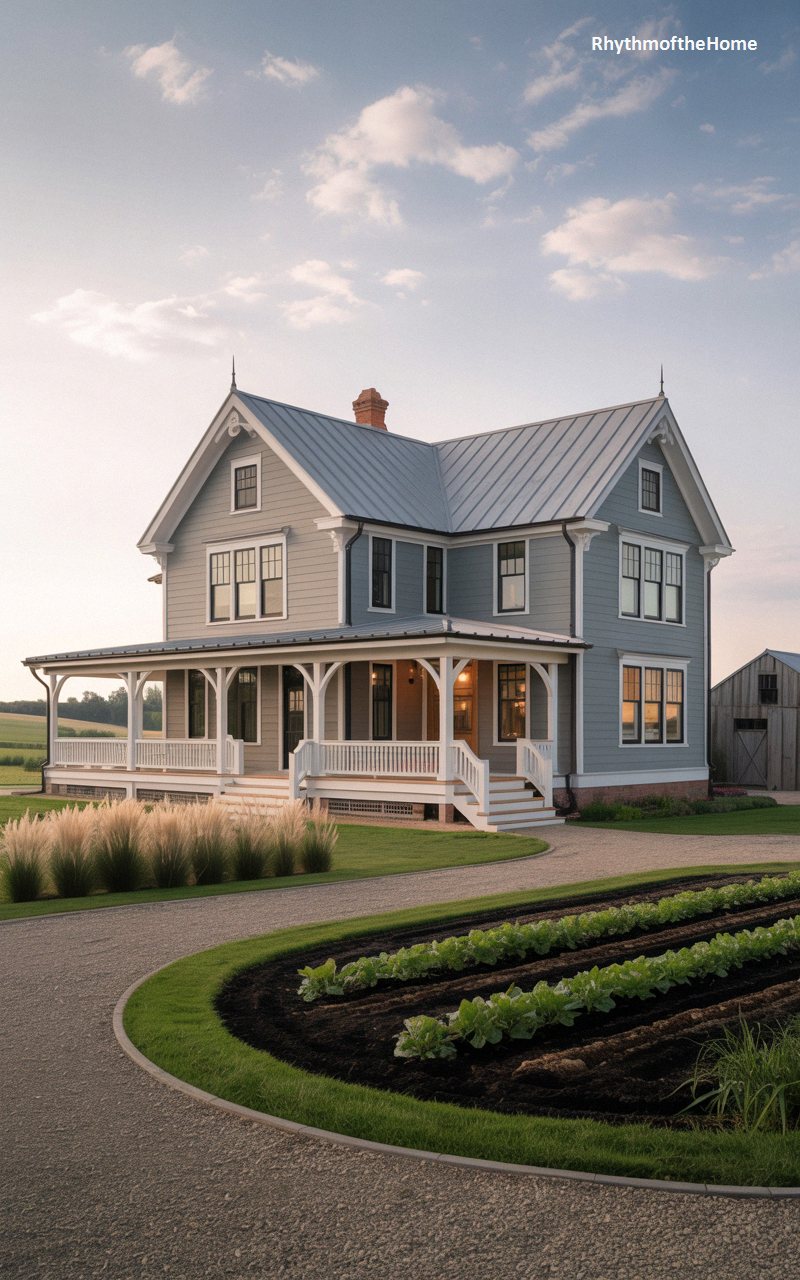 Standing proudly amidst neatly tilled agricultural fields, this pristine home seamlessly blends classic architectural lines with a fresh, contemporary finish. The exterior is clad in smooth, cool grey siding complemented by crisp white trim and a sleek, silver standing-seam metal roof that accentuates the steep, intersecting gables. A deep, wraparound porch features subtle arched details between the columns, offering a perfect vantage point over the manicured rows of crops and the sweeping gravel driveway. With a rustic wooden barn situated quietly in the background, this property represents a sophisticated, elegant update on traditional rural Victorian aesthetics.