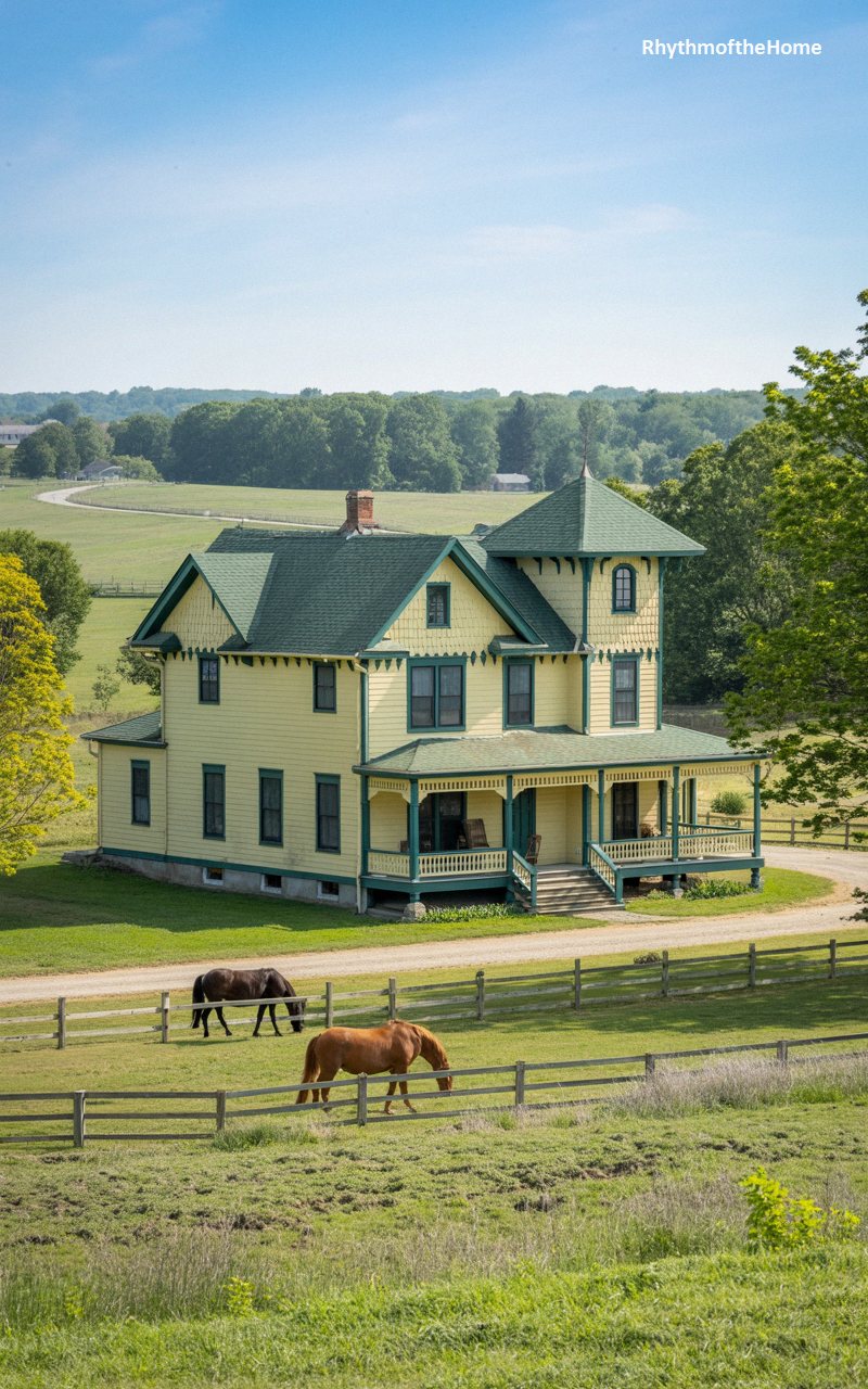 Set against a sweeping panorama of rolling green pastures, this striking farmhouse-style residence commands attention with its cheerful pale yellow siding and contrasting dark hunter-green trim. The architecture is defined by a prominent, square observation tower capped with a steep, green-shingled pyramidal roof, offering expansive views of the surrounding equestrian landscape. A generous wraparound porch, supported by elegantly simple columns, invites long afternoons of relaxation. In the foreground, beautiful horses graze peacefully behind a classic wooden post-and-rail fence, firmly establishing this historically inspired property as the idyllic centerpiece of a working country estate.