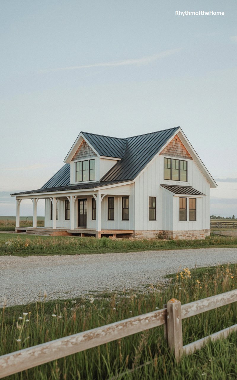 Reimagining historic silhouettes through a modern, minimalist lens, this striking home rises cleanly from the surrounding prairie. The exterior utilizes crisp white vertical board-and-batten siding, providing a sharp contrast to the bold, black standing-seam metal roof that covers the steep, intersecting gables. Warmth is introduced through natural cedar shakes nestled in the gable peaks and matching wood decking on the deep, inviting wraparound porch. Large, dark-framed windows maximize natural light while maintaining a clean, graphic aesthetic. Framed by a weathered wooden fence and wild grasses, this design offers a sophisticated, pared-down homage to Victorian grandeur.