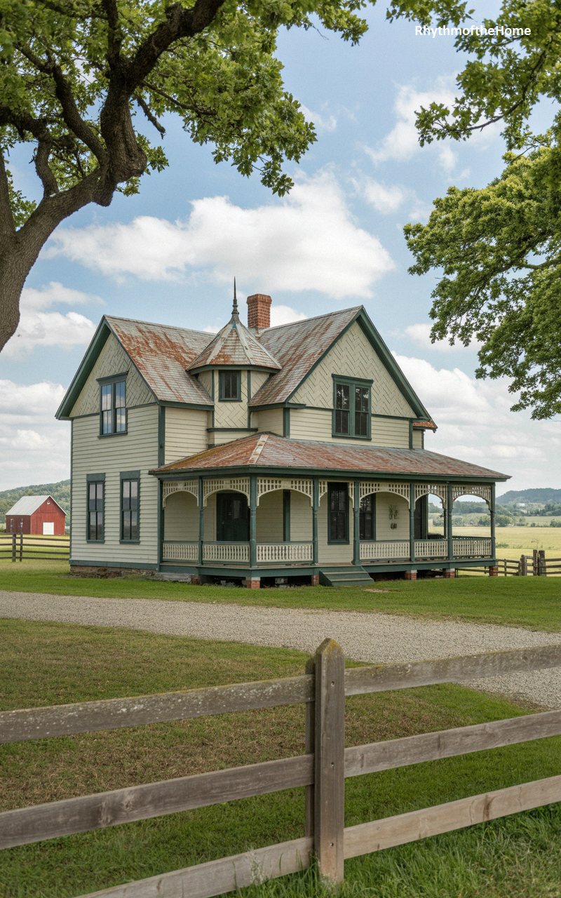 Exuding a profound sense of history, this majestic rural home features a beautifully weathered, rust-toned metal roof that adds remarkable character to the classic silhouette. The pale cream siding is elegantly outlined by faded forest-green trim, highlighting the home’s intricate architectural details, including the prominent octagonal corner tower crowned with a delicate finial. A sprawling wraparound porch boasts detailed spindle work and arched supports, perfectly capturing late-nineteenth-century craftsmanship. Framed by the dramatic, twisting branches of a massive, mature oak tree and overlooking a vibrant red barn, this estate stands as a proud, enduring monument to pastoral life.