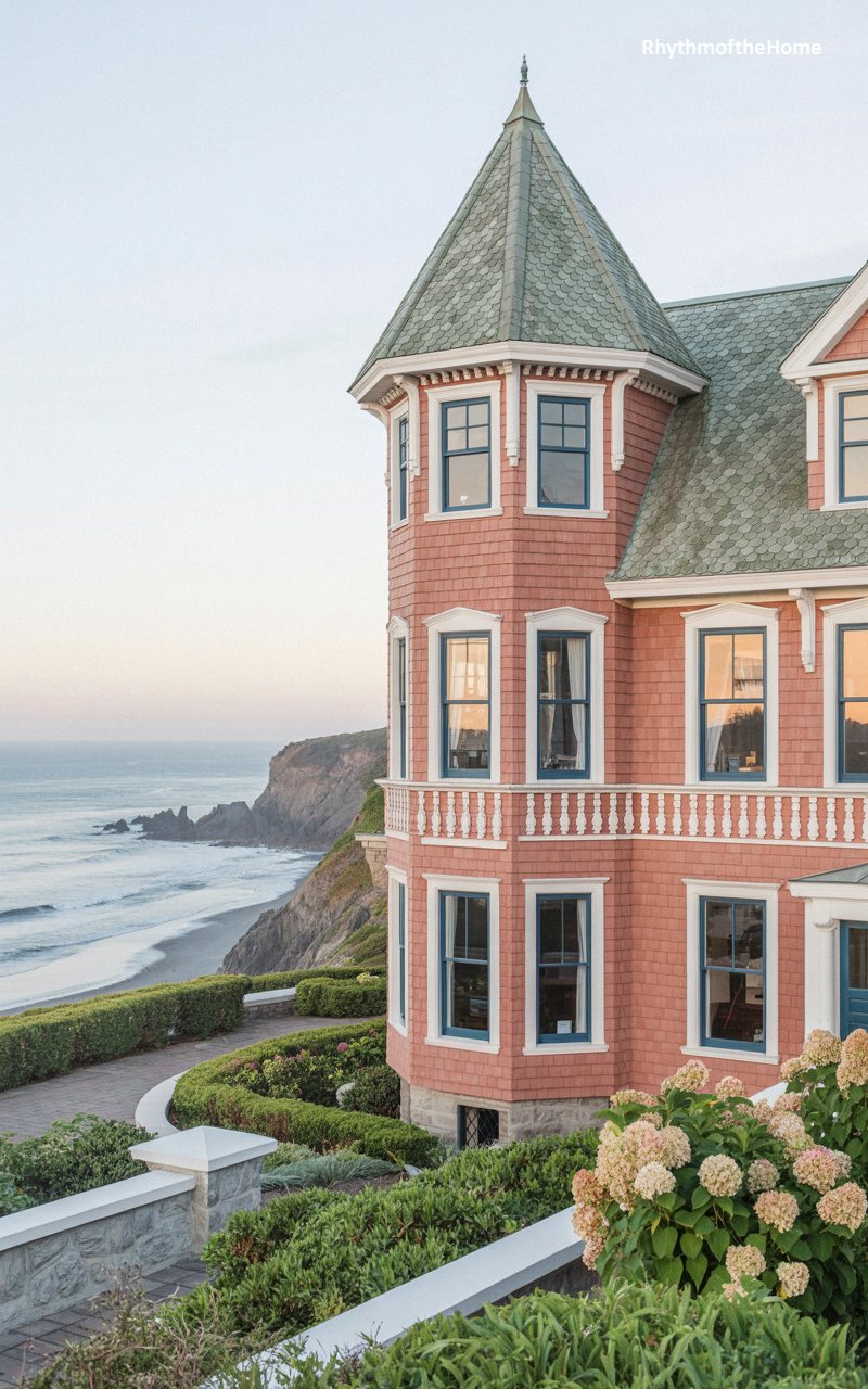 Perched dramatically on a lush cliffside overlooking the crashing waves of the ocean, this breathtaking residence is clad entirely in soft, dusty-rose shingles. The striking facade is dominated by a multi-story hexagonal tower crowned with a heavily textured, grey-green slate roof and a sharp finial. Crisp white trim and elegant balustrades delineate the different levels, while contrasting deep blue window sashes frame the expansive, breathtaking marine views. A meticulously landscaped garden featuring manicured boxwoods and blooming pink hydrangeas terracing down the slope completes this opulent, perfectly preserved Victorian gem of the sea.