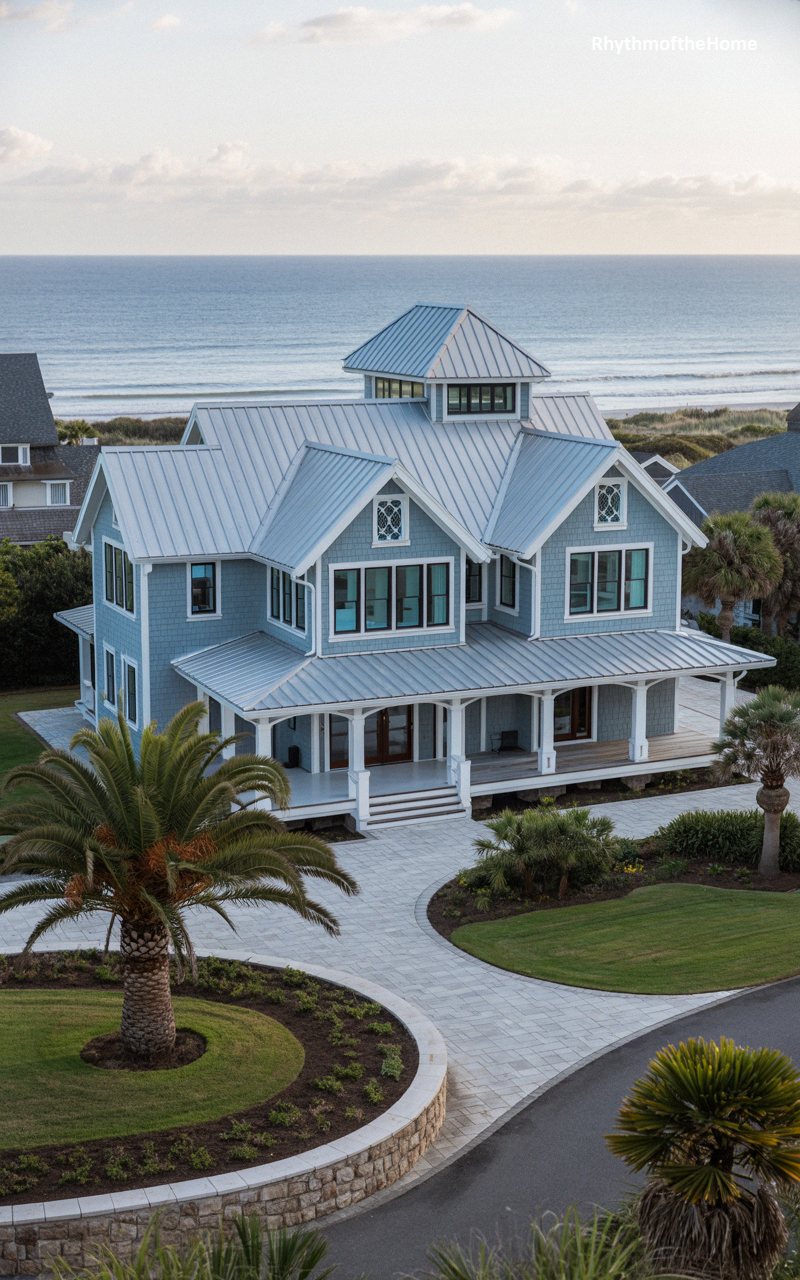 Blending traditional historic geometry with breezy coastal elegance, this stunning oceanfront property features soothing slate-blue siding contrasted by pristine white trim. A modern, light-reflecting silver metal roof caps the complex arrangement of gables and is crowned by a striking central square cupola with a multitude of windows. The deep, expansive front porch spans the entire width of the home, inviting residents to enjoy the salty sea breeze. An elegantly curved, light-stone paver driveway surrounds a manicured central lawn, while mature palm trees anchor the tropical, luxurious atmosphere of this seaside architectural masterpiece.