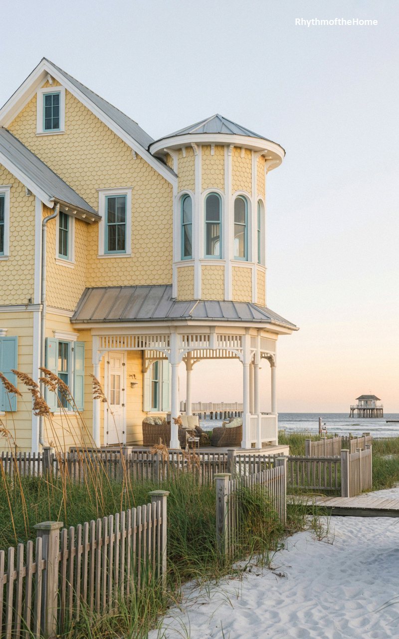 Bathed in the warm, ethereal glow of a beachside sunset, this cheerful home features a vibrant yellow exterior adorned with extensive, beautifully detailed fish-scale shingles. A prominent, smoothly rounded corner turret is the star feature, boasting elegant, tall arched windows that capture the fading light. A classic wraparound porch provides a shaded retreat, complete with cozy wicker seating facing the ocean breeze. Situated right on the sandy dunes, the property is framed by a weathered wooden slat fence, sea oats, and a distant pier, creating an idyllic, nostalgic picture of historic coastal living.