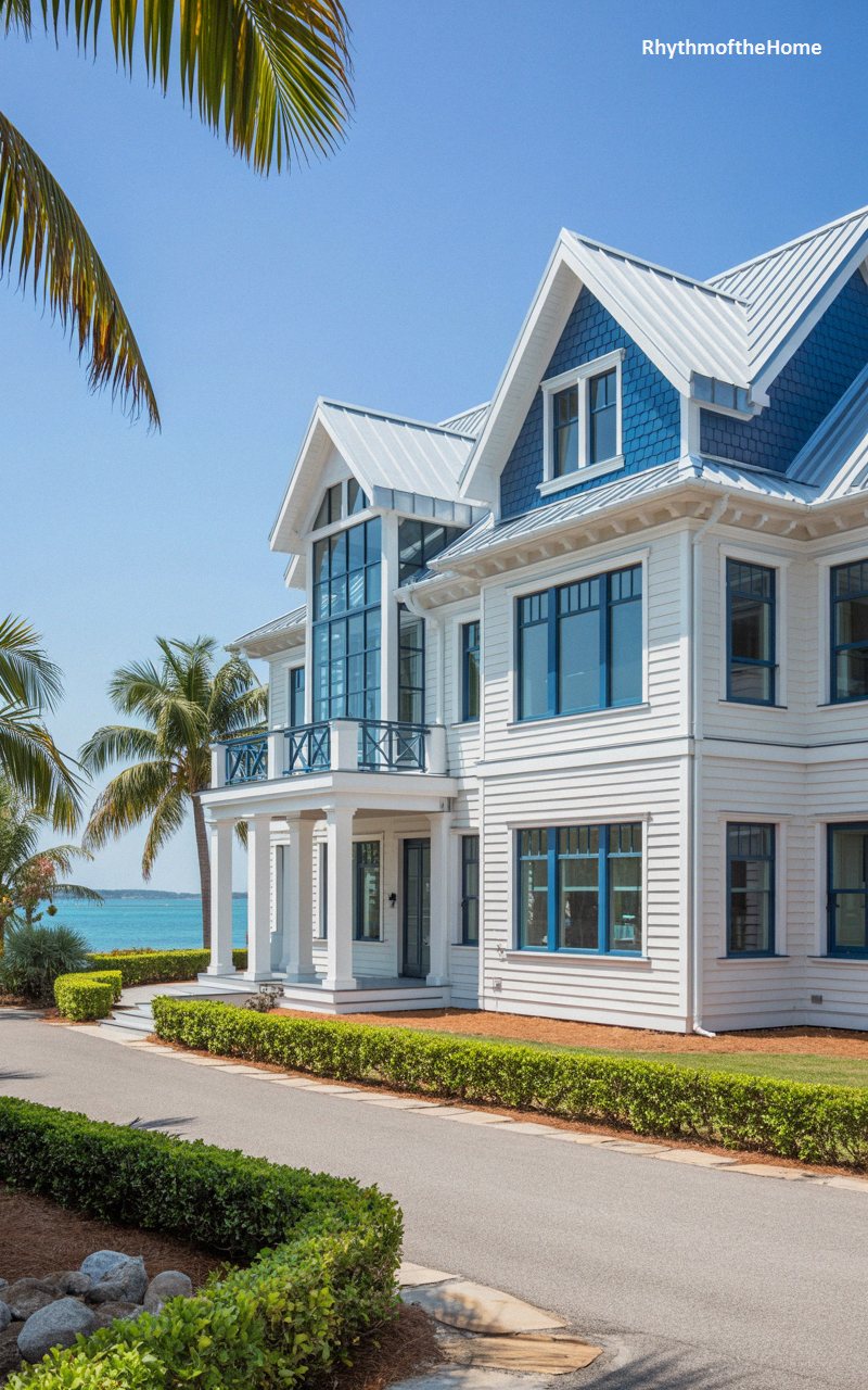 This spectacular coastal residence delivers a crisp, nautical aesthetic through its immaculate white siding and striking sapphire-blue accents. Deep blue window frames and matching fish-scale shingles nestled within the steep gables provide a bold, graphic contrast against the light facade. A highly unique, modern glass-enclosed atrium space spans the second and third floors above the front entrance, offering unhindered views of the adjacent turquoise waters. The clean lines of a silver standing-seam metal roof reflect the bright sun. Framed by swaying palm trees and manicured hedges, this home offers a luxurious, historically inspired island retreat.
