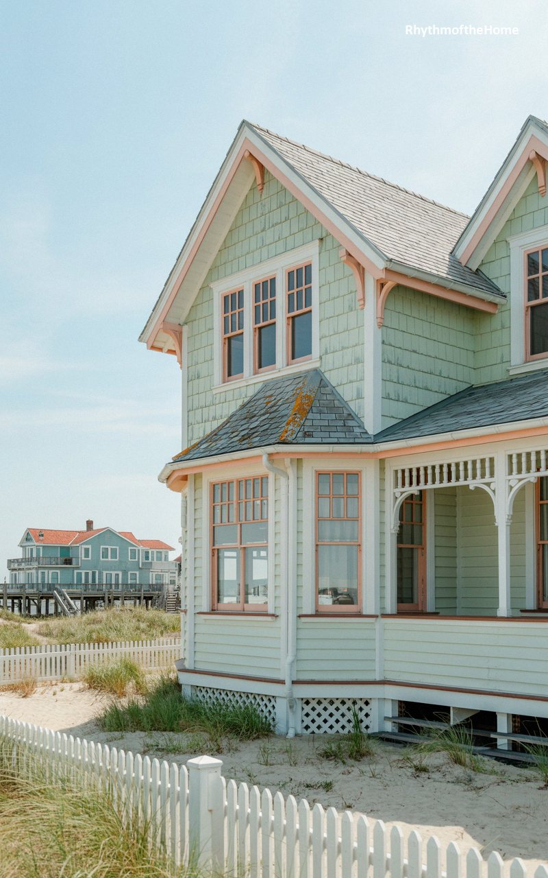 Exuding playful, vintage charm, this delightful seaside cottage is painted in a soothing, pale mint green, accented beautifully by soft, peachy-pink trim outlining the windows and rooflines. The highly detailed front porch is a masterpiece of delicate carpentry, featuring elegant arched spans and intricate spindle work. A textured, multi-toned grey slate roof caps the sharp gables and the subtle bay window extension. Rooted directly in the soft beach sand and enclosed by a classic, low white picket fence surrounded by sea grass, this home captures the whimsical, romantic essence of a historic seaside holiday retreat.
