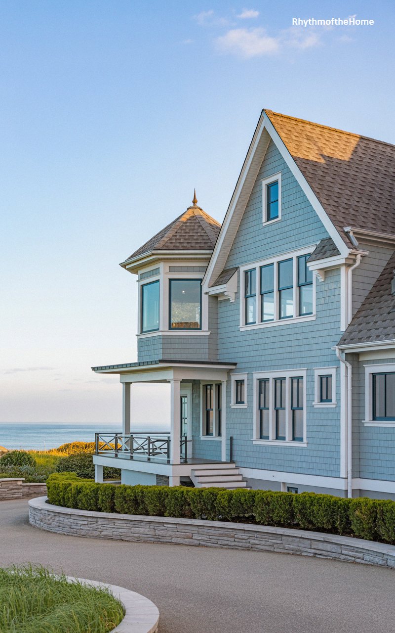 Commanding a breathtaking view over the expansive ocean, this elegant, sprawling home is wrapped entirely in soft, sky-blue shingles, beautifully unified by crisp, bright white trim. A prominent octagonal corner tower with large, dark-framed windows offers panoramic seaside vistas under its steeply pitched roof. The generous wraparound porch features a clean, simple railing, providing an unobstructed connection to the dramatic coastal environment. The property is grounded by an impressive, curving retaining wall built from rough-hewn, light-grey stone, leading up an immaculate sweeping driveway that emphasizes the home’s grand, stately presence on the bluff.