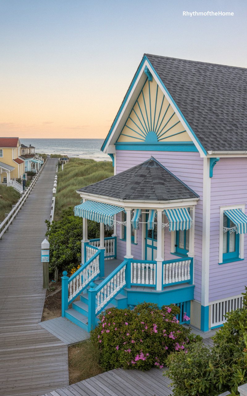 Vibrant and utterly whimsical, this stunning home boasts a lively lavender exterior dramatically outlined by bright, energetic teal trim and lively yellow accents. The main front gable features a spectacular sunburst motif, a quintessential hallmark of exuberant Victorian design. Playful blue-and-white striped awnings shade the windows and the cozy, beautifully detailed front porch. Situated directly alongside an iconic wooden beach boardwalk winding through sandy, grass-covered dunes, the property evokes a sense of nostalgic, carefree summer joy. A stunning sunset over the ocean provides the perfect backdrop for this beautifully preserved, colorful historic gem.