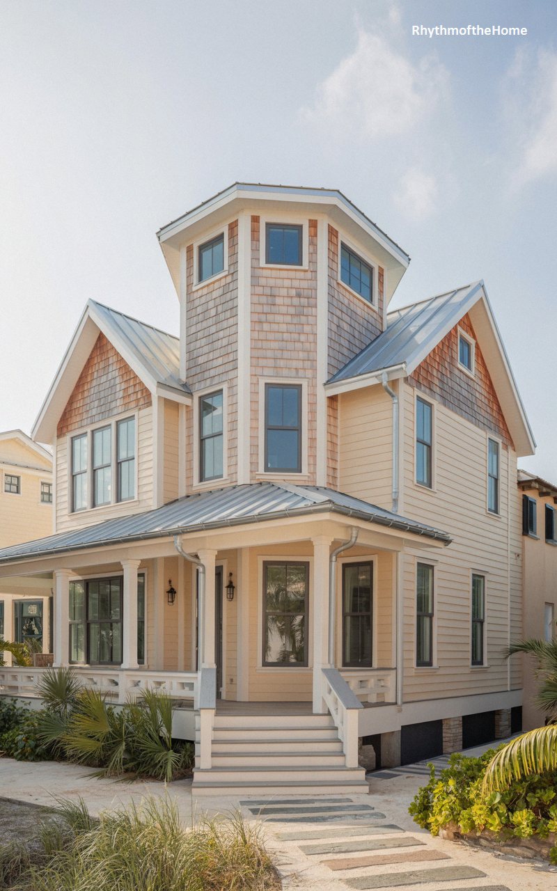 Blending historic form with a relaxed, tropical vibe, this lovely home features a prominent, central octagonal tower that acts as an architectural lighthouse. The exterior pairs smooth, pale cream siding with warm, natural cedar shingles in the gables and wrapping the upper tower section, adding beautiful organic texture. A sleek, grey standing-seam metal roof provides a modern, weather-resistant cap. The deep, welcoming front porch relies on clean, sturdy columns rather than ornate gingerbread, offering a breezy, updated aesthetic. Framed by palm fronds and a sandy coastal pathway, this residence epitomizes sophisticated, sun-drenched island living.