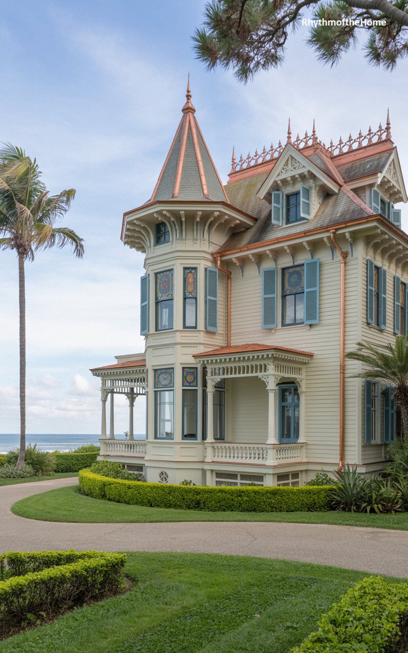 A breathtaking showcase of ornate Victorian architecture, this exquisite residence features a soft, creamy yellow facade accented by beautiful, muted blue louvered shutters. The absolute focal point is the magnificent corner turret, capped with a gleaming, steeply pitched copper roof and an elegant finial. Highly intricate, colorful stained-glass transoms adorn the large bay windows, adding a layer of opulent historic charm. The elaborate wraparound porch boasts delicate, lace-like fretwork and spindled arches. Surrounded by lush, manicured greenery and swaying palm trees, this spectacular estate is a flawlessly preserved testament to nineteenth-century grandeur and craftsmanship.