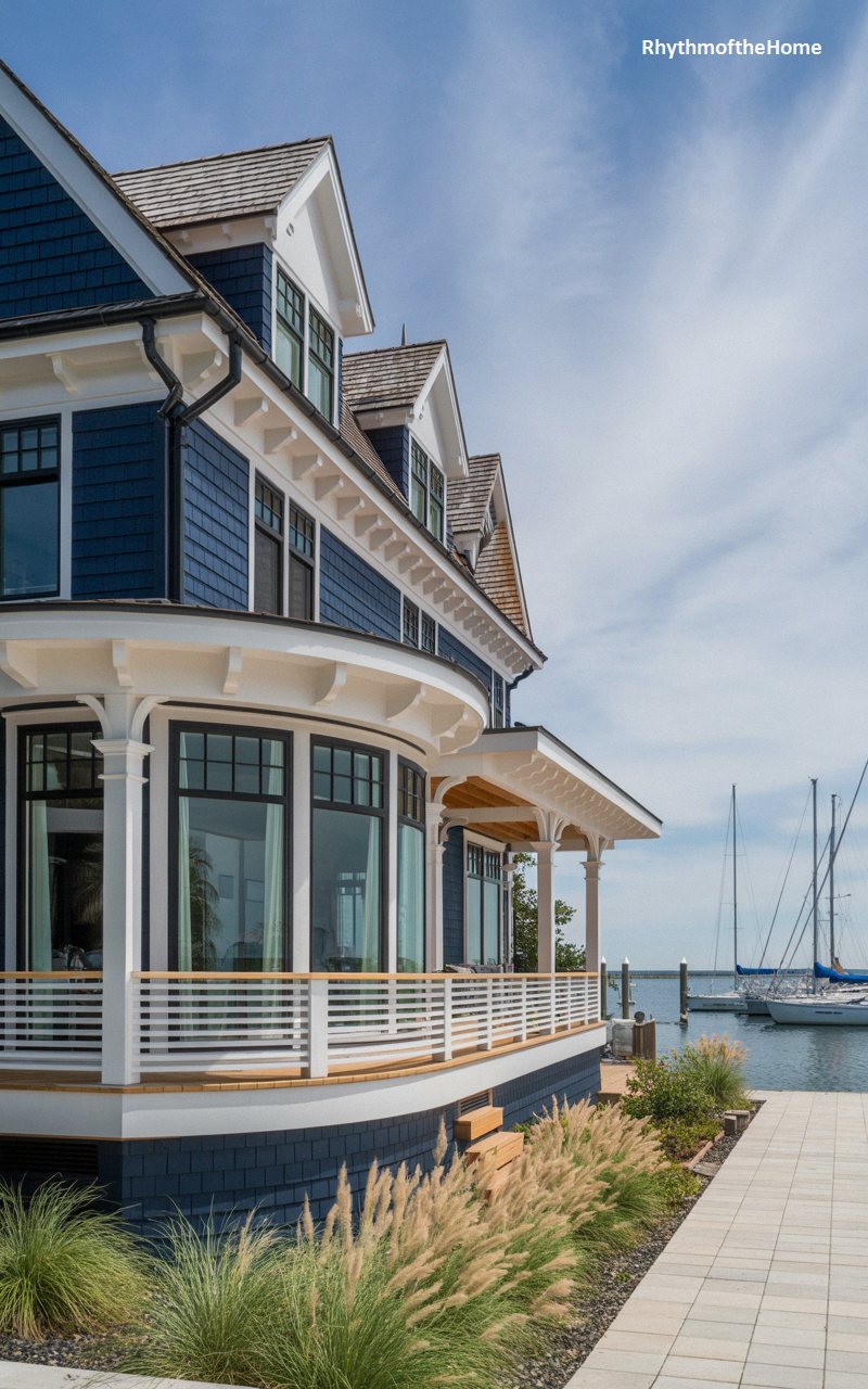 Marrying historic charm with a prominent nautical lifestyle, this striking coastal home is wrapped in rich, deep navy-blue shingles. Crisp white trim provides a bold, maritime-inspired contrast, particularly highlighting the magnificent, smoothly curving wraparound porch and enclosed sunroom that dominate the ground floor. The expansive windows offer unhindered views of the adjacent marina, where sailboats rest quietly on the sparkling water. Warm, natural wood tones on the porch ceiling and flooring soften the sharp color palette. A modern, light-stone paver walkway elegantly approaches this sophisticated, uniquely updated historic gem by the sea.