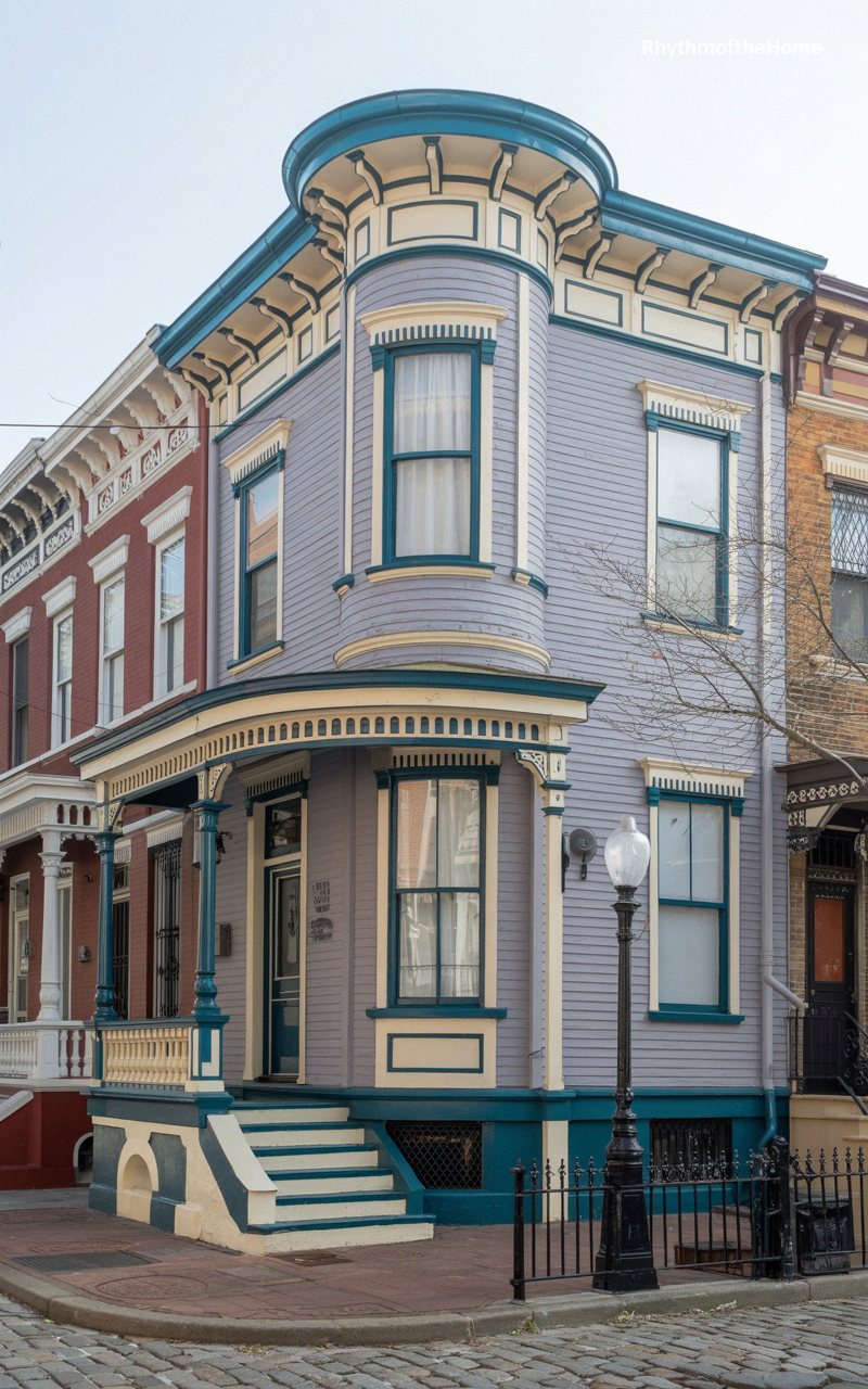 Occupying a prominent city corner, this magnificent urban townhouse makes a bold statement with its unique muted lavender-grey siding. The intricate architectural details are expertly highlighted by deep teal trim and soft cream accents. A stunning, smoothly curved bay window structure spans the upper floors, acting as a subtle turret that commands the street view. The ground-floor entrance is sheltered by a beautifully ornate, overhanging porch supported by turned columns. Standing tightly beside its historic brick neighbors along a cobblestone street, this impeccably restored residence perfectly captures the elegance and vibrancy of historic city living.