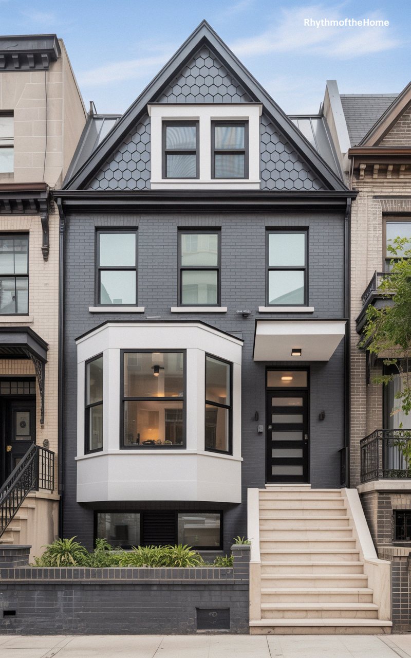 This stunning urban townhouse presents a masterful, moody modernization of classic Victorian architecture. The facade is defined by richly textured, dark charcoal-grey painted brick, complemented by a dramatic peak clad in grey hexagonal shingles. A prominent, angled bay window structure juts outward, updated with crisp white trim and bold, black-framed modern windows that flood the interior with light. A sleek, contemporary black front door sits beneath a minimalist, flat-roofed portico. The stark, pale stone of the grand entry staircase provides a powerful, highly sophisticated contrast, creating a striking contemporary gem on a historic city block.