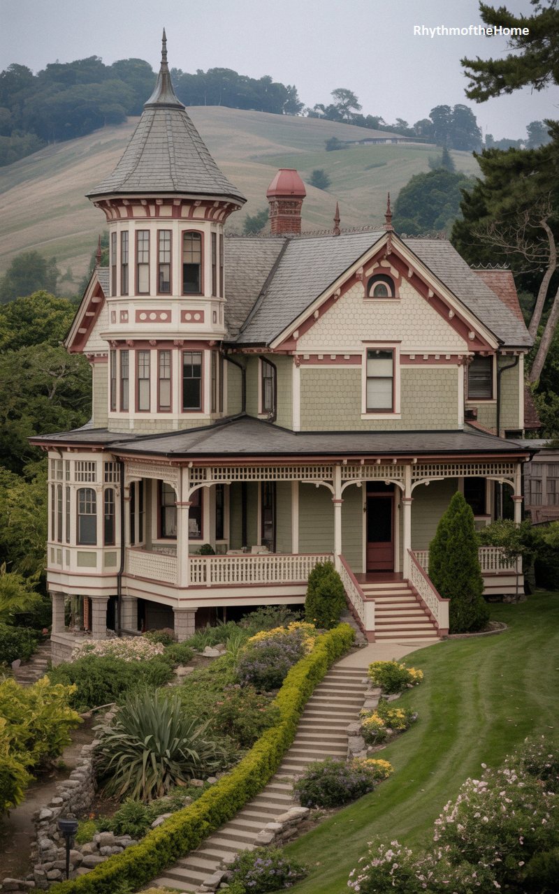 Set against a dramatic backdrop of rolling, misty hills, this spectacular estate is a masterclass in highly ornamented Victorian design. The facade features soft olive-green siding, richly contrasted by deep maroon trim outlining the windows and the complex rooflines. A towering, octagonal corner turret dominates the structure, capped with a steeply pitched, flared roof. The incredibly elaborate, deep wraparound porch boasts delicate arches, spindled railings, and extensive gingerbread fretwork. Approached by a grand, terraced stone staircase flanked by impeccably manicured landscaping, this property exudes an aristocratic, commanding presence over its breathtaking rural domain.