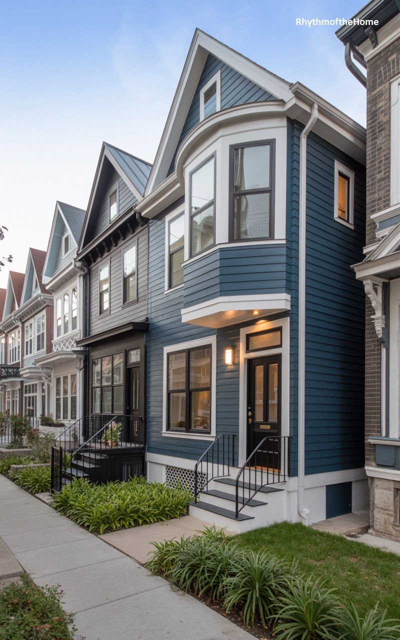 Offering a striking, contemporary take on historic city architecture, this narrow townhouse commands attention with its rich, dark indigo-blue siding. The facade features a prominent, multi-story angled bay window that pushes out toward the street, maximizing interior space and light. Crisp white trim sharply outlines the rooflines and separates the different architectural volumes, while modern black window casings and a sleek black front door ground the design. A minimalist black metal railing guides the eye up the starkly contrasting pale stone steps, creating a highly sophisticated, modernized historic profile nestled perfectly into its urban environment.