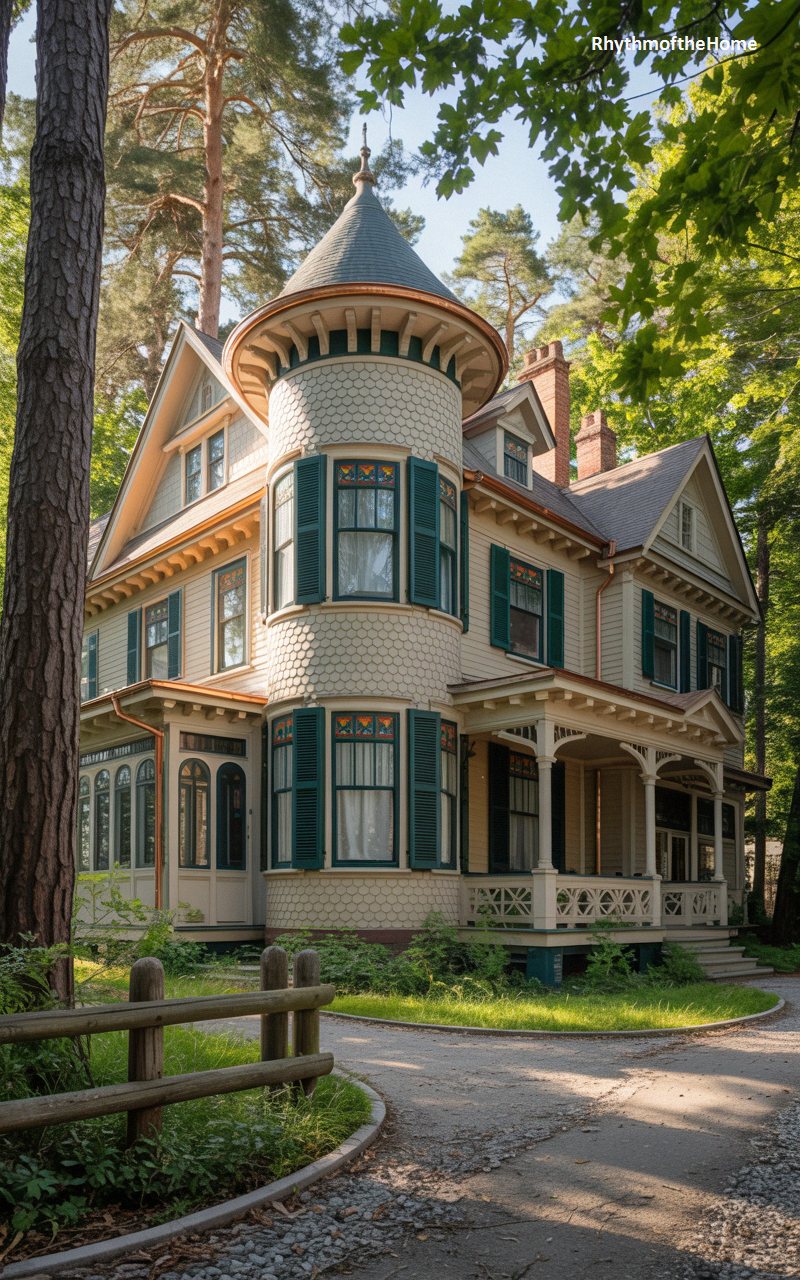 Immersed in the dappled shade of towering, ancient pines, this remarkably preserved residence exudes quiet, historical grandeur. The facade is painted a soft, buttery yellow, beautifully contrasted by traditional dark forest-green louvered shutters and trim. A magnificent octagonal corner tower is the focal point, enveloped completely in textured fish-scale shingles and crowned with a delicate copper finial. The inviting wraparound porch features intricate, lace-like spindled details and sturdy, substantial columns. Colorful, original stained-glass transoms add a touch of hidden luxury to this deeply enchanting, classically faithful woodland retreat located at the end of a winding gravel drive.