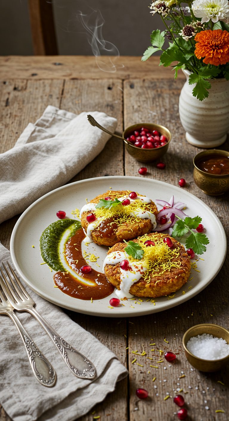 - 6) Assemble 2 patties per plate: spoon 2 tbsp yogurt over each, then 1–2 tbsp tamarind chutney and 1 tbsp mint chutney. Scatter onions, sev, and cilantro; finish with chaat masala, chili powder, roasted cumin, and pomegranate.