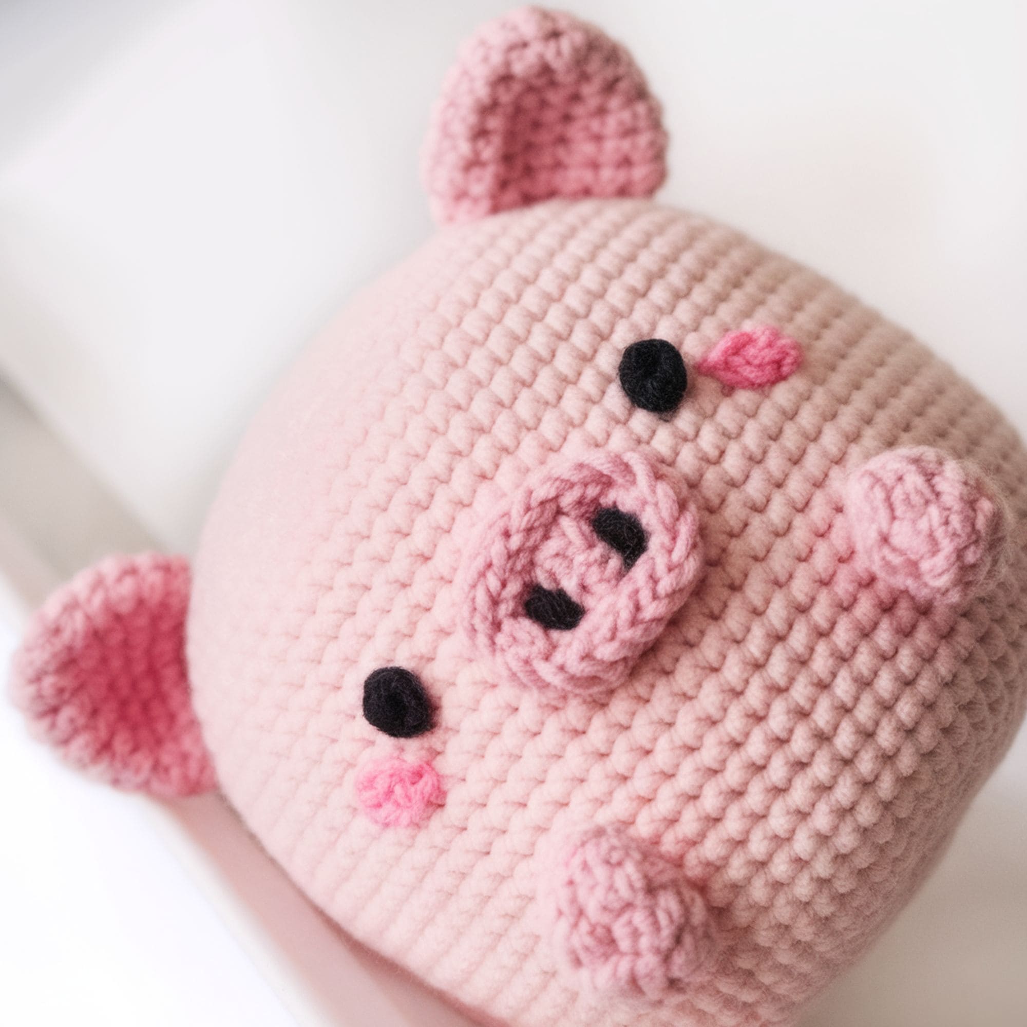 Resembling the look of an emoji, this squarely-shaped little piggy could be a fun amigurumi to try crafting. The pattern for this project is available for free. This cute pig is designed with rich details, including blushing cheeks and pink ears. Thanks to its palm-sized visual appeal, the amigurumi is extra cute and simple to create.