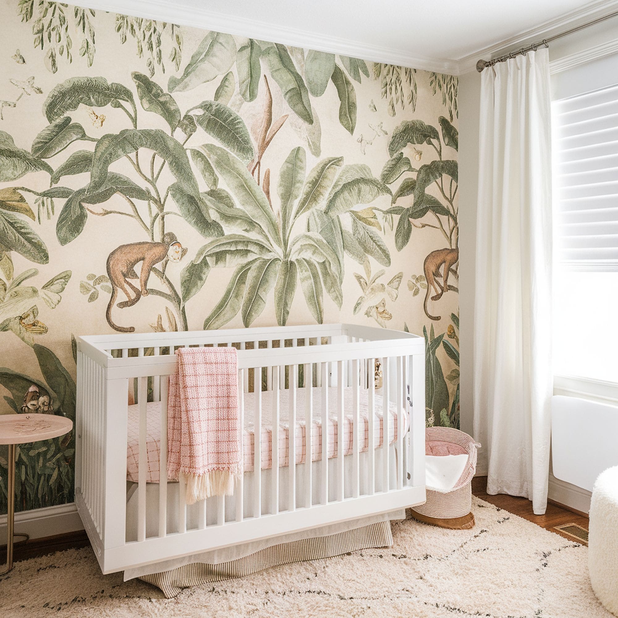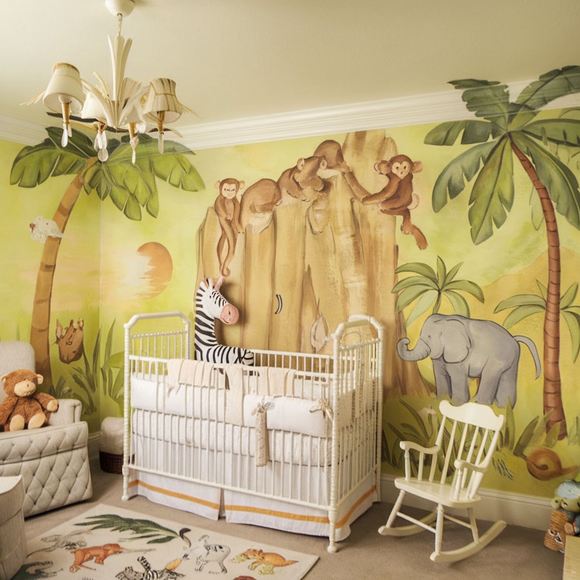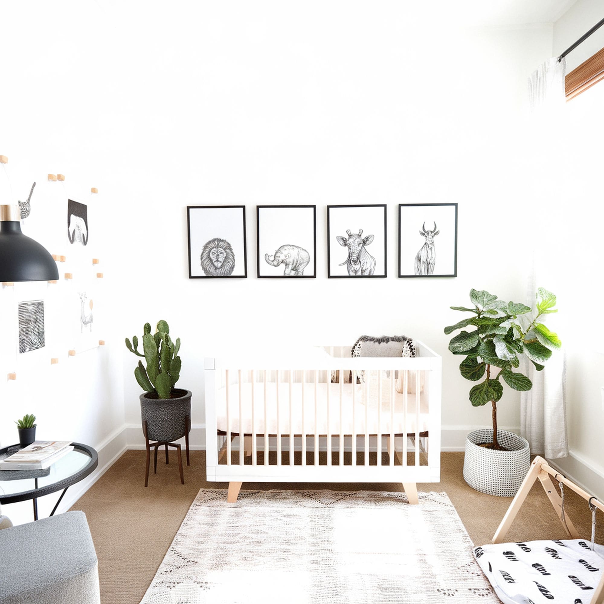 If you wish to avoid an overdone look with too many wacky animal motifs, you can try a modern minimalist idea like this bright nursery. The slight jungle theme is still here but it feels more like a background element of the room instead of the main focal point. Focus on little details like a simple gallery grid or exotic indoor trees to bring this idea to life. Animals can be included through simple accents like a playful lion rug such as this one from Amazon.