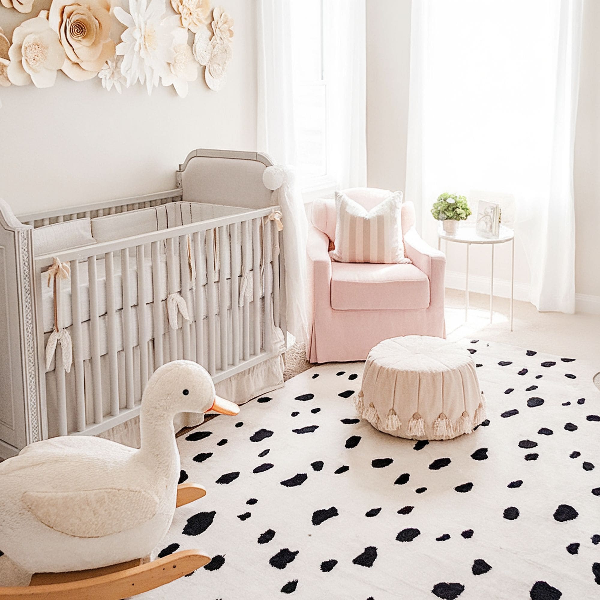 Check out this graceful nursery that incorporates charming swan décor in lovely shades of blush pink. This is a very creative animal theme you can try for a little girl’s room. The addition of gold accents creates a fabulous impression contrasting with the overall white and pink color scheme. The paper flower wall decoration contributes to the soft and graceful vibes of the swan motif.