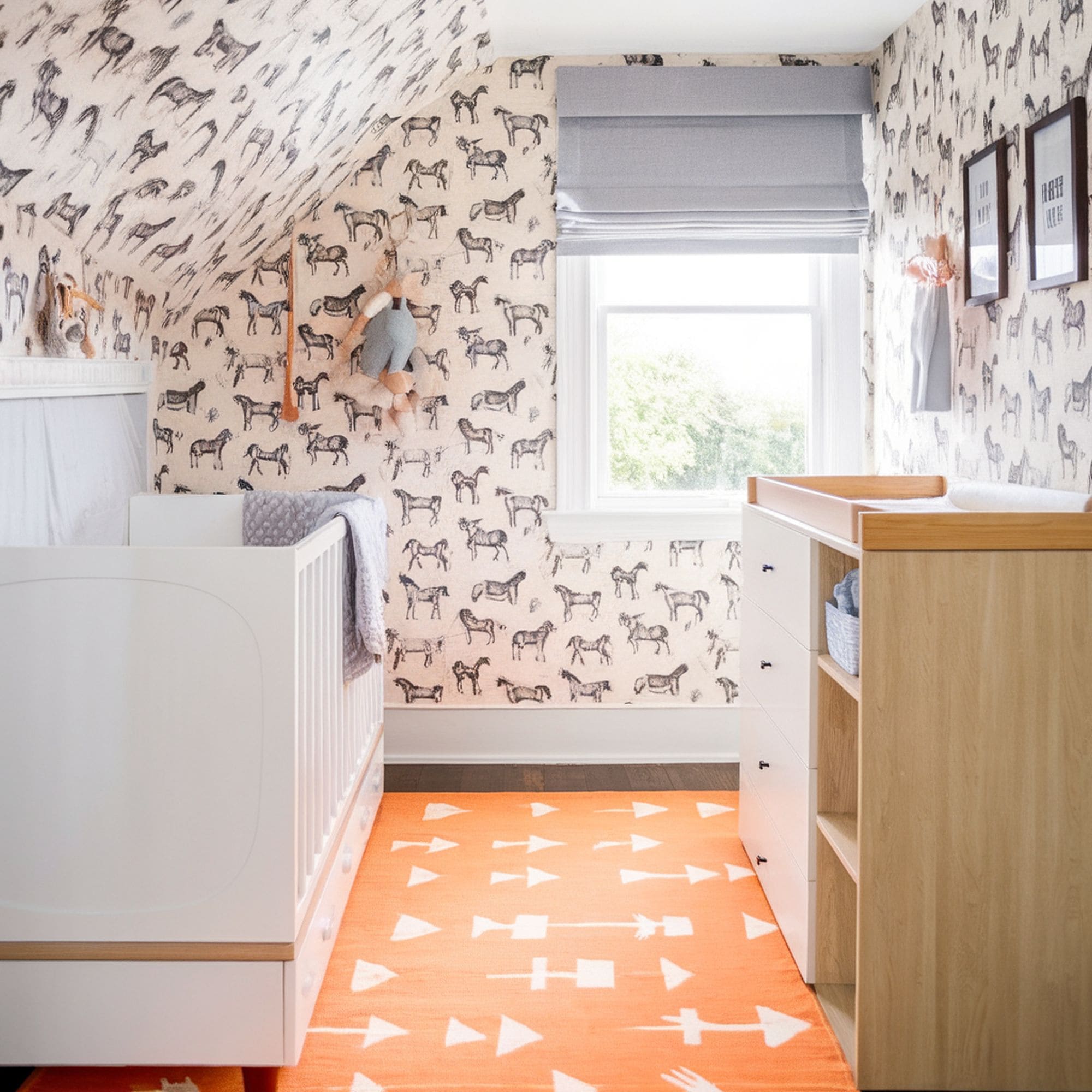 Wild horses and nurseries can work well together. Check out this inspirational theme idea that relies on a dazzling black and white wild horse print. To break the monotony of the monochrome design, the creator of this nursery added a pop of color through the orange floating shelves and coral rug. Both energetic and girly, the wild horse theme is definitely underrated as far as animal themes for nurseries go.