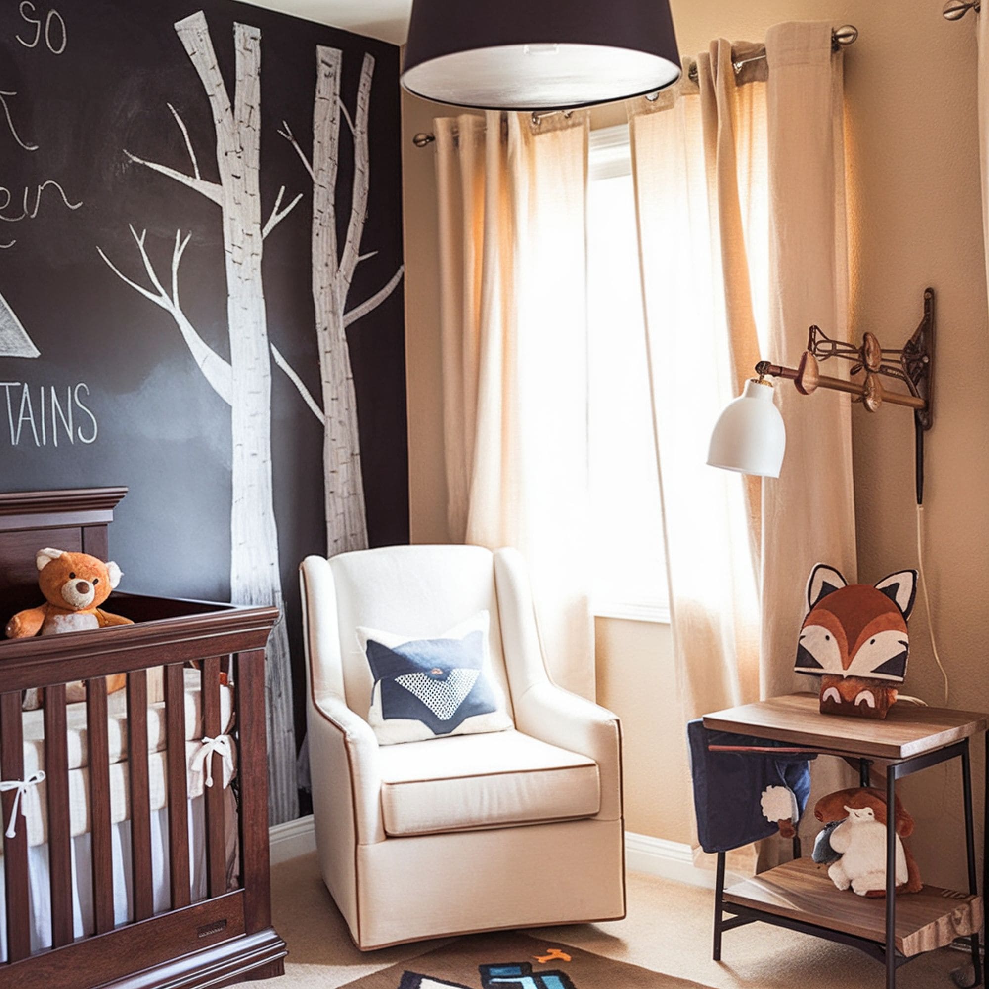 A few well-placed fox motifs can create a subtle yet impactful theme for any nursery space. This room is a great example as it relies on neutral colors and minimalist décor. The foxy throw pillow looks gorgeous when paired with the drawn trees on the wall. Subtle autumn forest vibes are created thanks to the occasional splash of orange color that takes your mind to foxes.