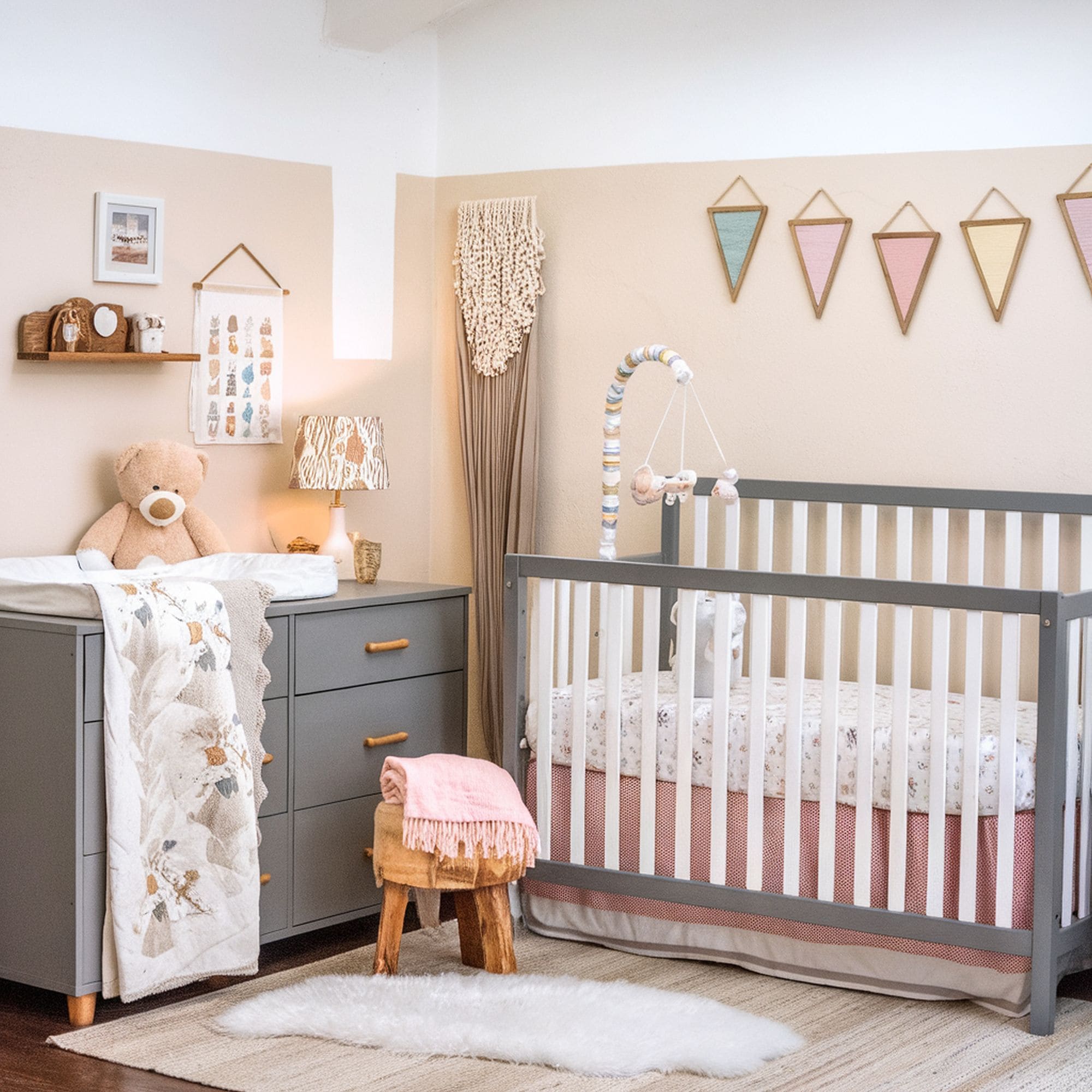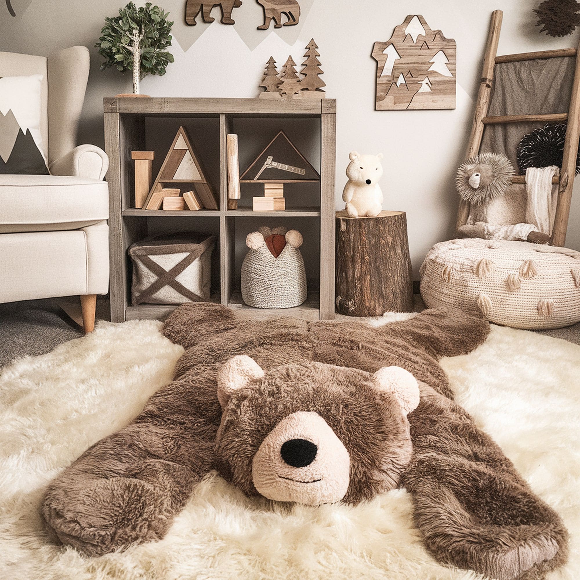 The standout feature of this room is the fluffy bear rug which boosts the textural feeling of the nursery and maximizes the hygge atmosphere. Thanks to multiple other elements that take your mind to a cozy forest, this bear-themed nursery could be a hit with any baby child.