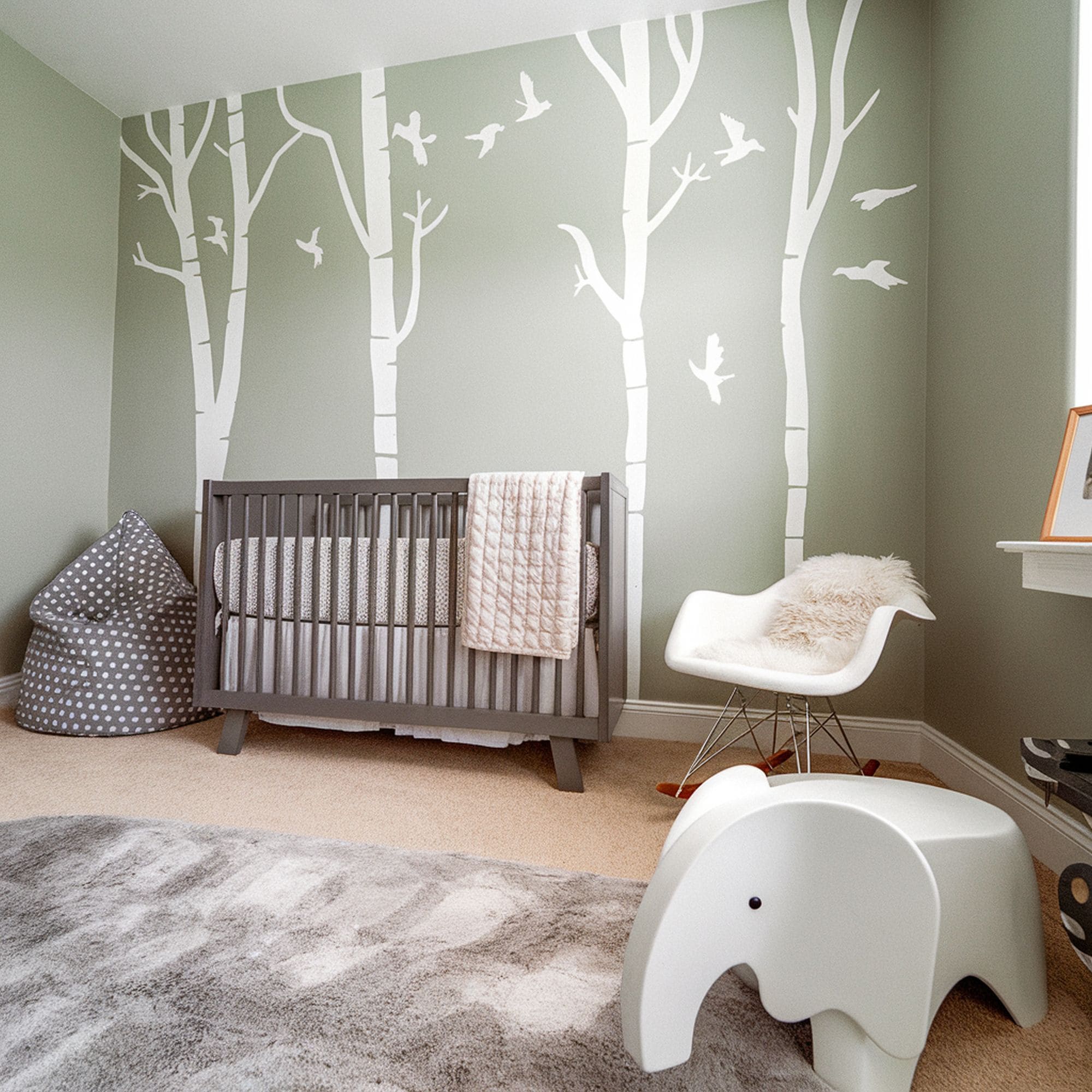 There are countless variations of a jungle theme to be integrated into a nursery. This room shows one of our favorites which takes a subtler approach to jungle motifs. Animal decorations are used quite sparingly while the focus is on the color scheme and overall playful minimalism. The side table has an elephant shape making a lovely pairing with the wall decals.