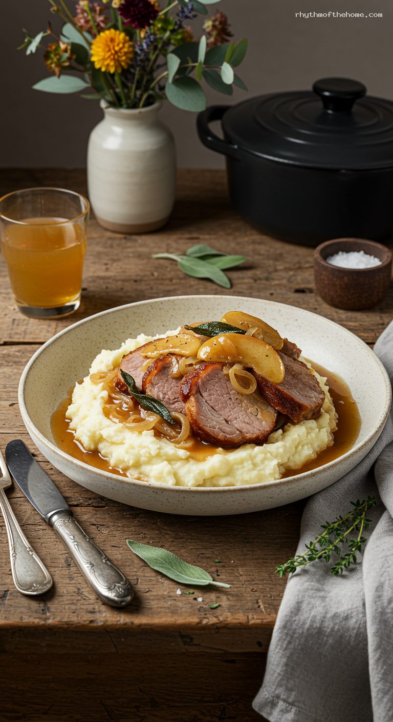 Transfer the pork to a board and tent with foil for 10 minutes. Skim excess fat from the braising liquid. Discard bay leaves and thyme stems. Set the pot over medium heat and simmer until the liquid reduces to a glossy sauce, about 8 to 12 minutes. Whisk in the remaining 1 tbsp Dijon and 1 tbsp apple cider vinegar, then swirl in 1 tbsp butter. Adjust salt and pepper to taste. Shred or slice the pork. Spoon mash into warm bowls, pile on the pork, and ladle over the apple-onion-sage sauce with tender apple slices. Garnish with torn fresh sage.
