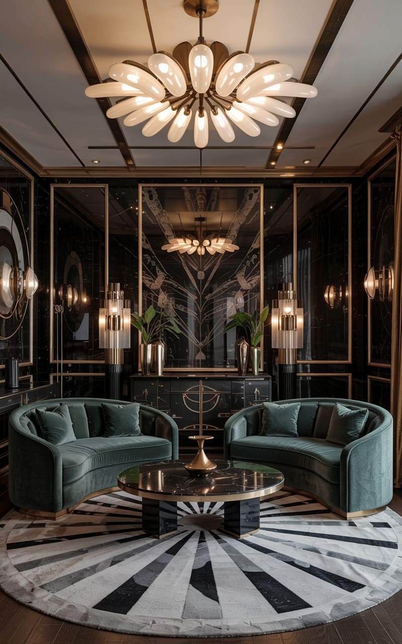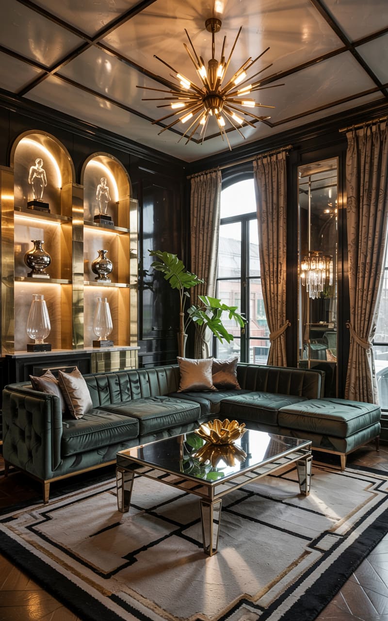 A symphony of emerald green velvet and high-gloss black lacquer defines this opulent Art Deco salon. A magnificent sputnik chandelier explodes with golden light, its rays mirrored in the arched, illuminated display niches showcasing curated treasures. Rich drapery frames a tall window, allowing a gentle radiance to grace the room, highlighting the plush textures and the geometric intricacies of the area rug. The mirrored coffee table reflects the scene, amplifying the room’s decadent allure and creating an atmosphere of sophisticated indulgence, perfect for evening soirées where hushed conversations mingle with the clinking of glasses.