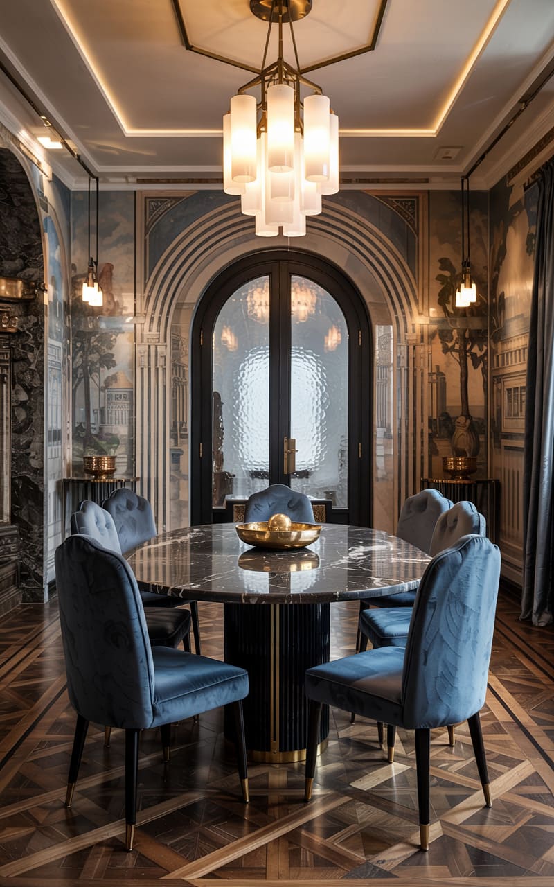 A grand, arched doorway with frosted glass panels forms the focal point of this striking Art Deco dining room. Pale blue velvet chairs with elegant wooden legs surround a substantial black marble-topped table, its surface reflecting the soft glow from the magnificent tiered chandelier above. The walls are adorned with a breathtaking mural depicting classical architectural scenes, rendered in muted blues and grays, lending an air of timeless sophistication. Parquet flooring laid in a complex pattern adds another layer of texture, creating a space that feels both formal and invitingly artistic, a perfect setting for memorable feasts.