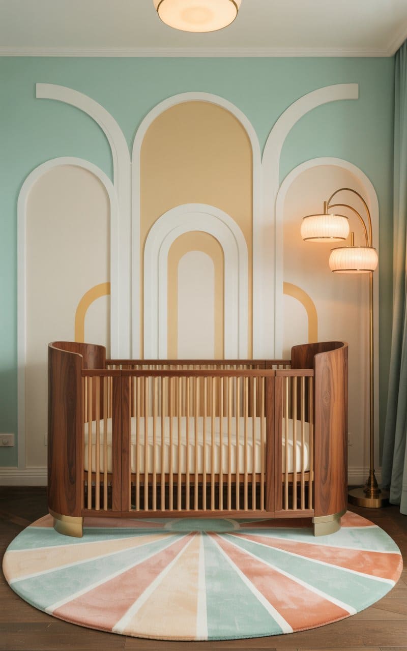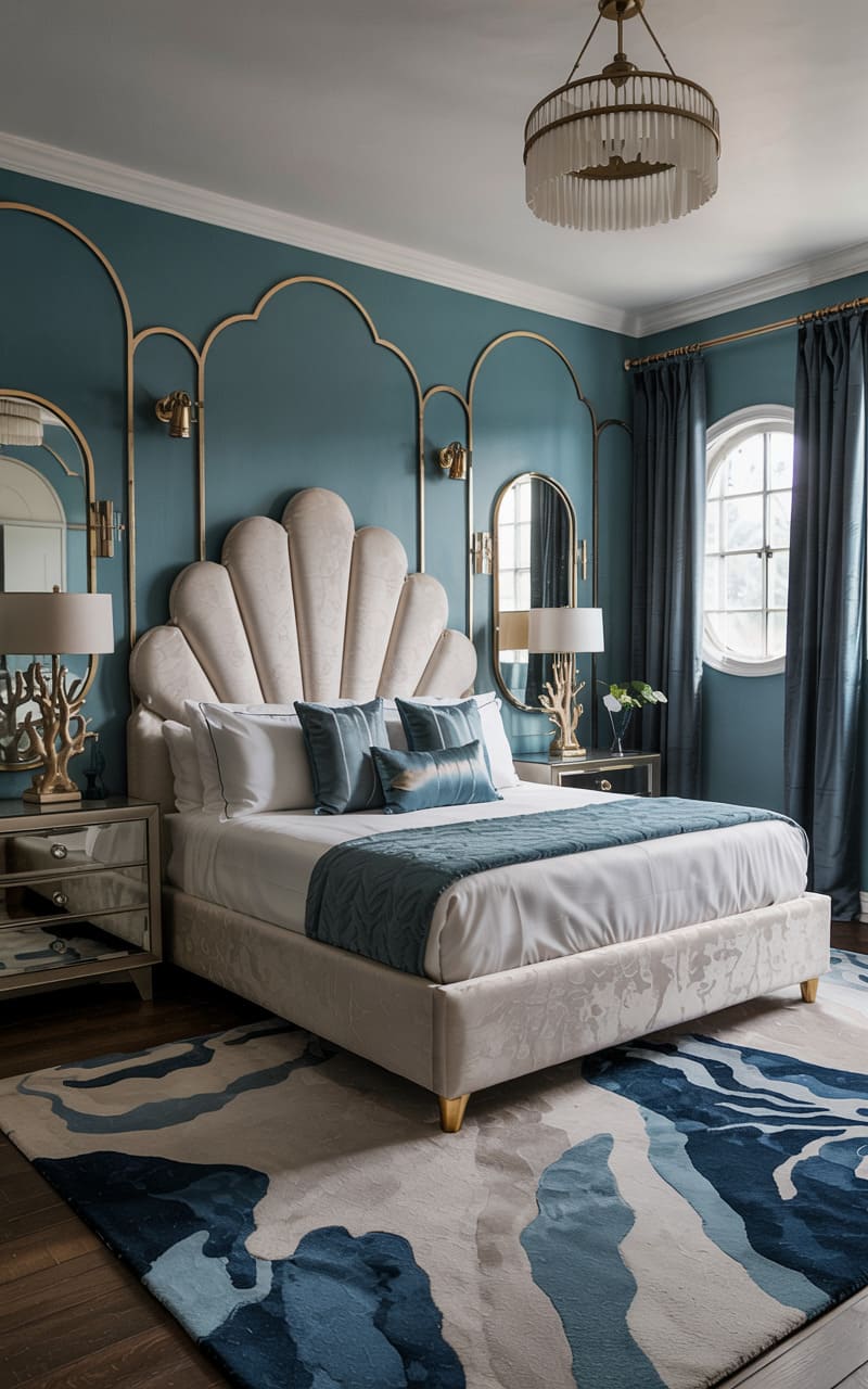 Serene teal walls, accented with delicate gold trim forming sinuous, organic curves, create a tranquil haven in this Art Deco bedroom. The bed, with its magnificent shell-shaped, cream-upholstered headboard, stands as a sculptural centerpiece, dressed in crisp white linens and teal accent pillows. Mirrored nightstands reflect the room’s gentle illumination from a circular, fringed chandelier and coral-like lamps. A bold, abstract blue and cream rug grounds the space, its wave-like patterns echoing the coastal-inspired serenity. This chamber is a testament to refined comfort, a peaceful retreat infused with understated glamour and artistic flair.