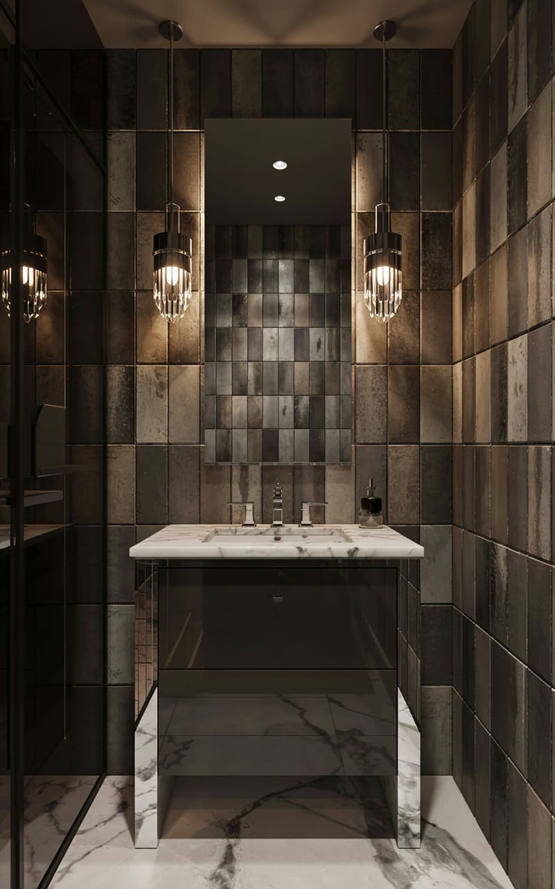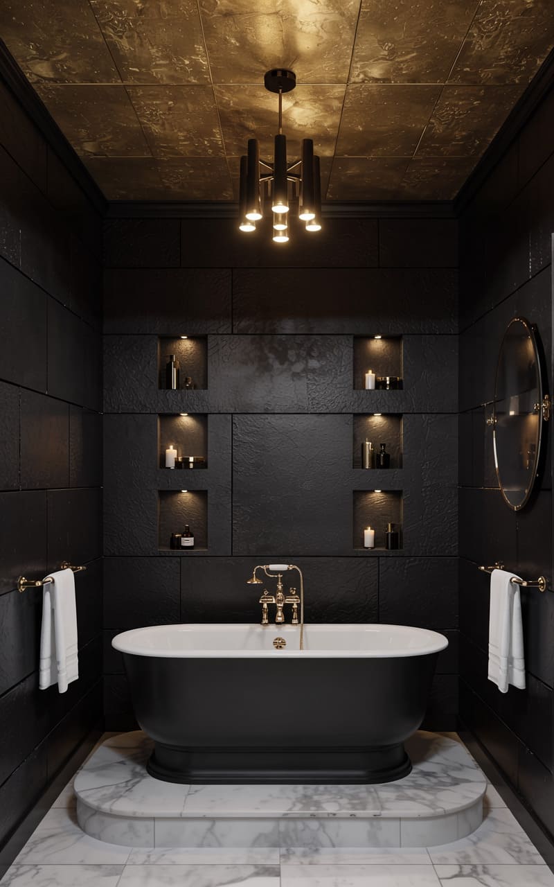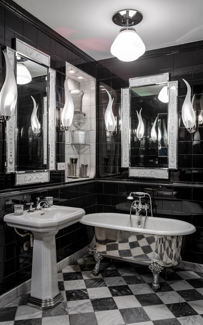 Monochromatic drama unfolds in this Art Deco bathroom, where glossy black tiles sheath the walls, creating a stark, reflective canvas. A classic white pedestal sink and a claw-foot bathtub, its exterior gleaming with a metallic, checkered finish, provide striking contrast. Multiple mirrors, framed in white, amplify the space and reflect the unique, flame-shaped wall sconces that cast an ethereal glow. The floor, a bold checkerboard of black and white marble, completes the scene, evoking a timeless, cinematic quality. This bathroom is a study in bold contrasts and polished surfaces, exuding a vintage allure.