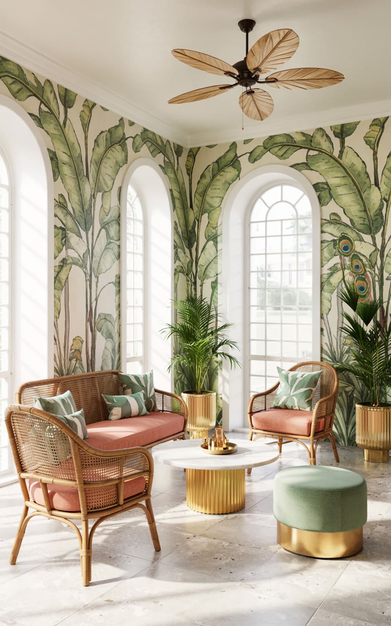 Tropical exuberance meets Art Deco elegance in this airy sunroom, where arched windows allow a profusion of natural light to animate the space. Walls adorned with a vibrant, hand-painted mural of lush banana leaves create an immersive, verdant backdrop. Rattan and cane furniture, with cushions in soft coral and patterned green, offers comfortable seating. A whimsical, leaf-bladed ceiling fan circulates the air, enhancing the room’s breezy charm. Polished stone flooring and brass accents on the coffee table and planters add a touch of Deco sophistication to this bright, nature-infused retreat.
