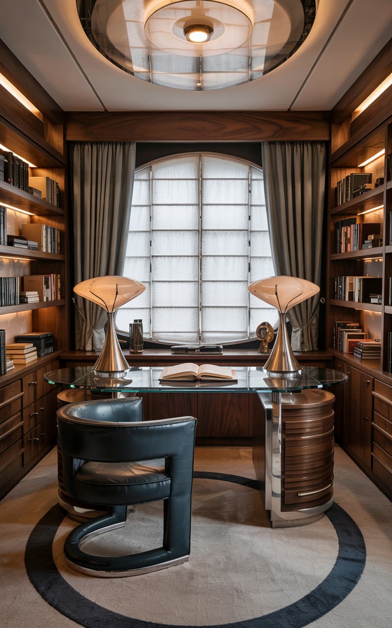 Encased in rich, polished wood, this Art Deco study exudes an air of studious luxury and nautical charm. Bookshelves, illuminated by soft strip lighting, line the walls, filled with literary treasures. A sleek glass-topped desk, supported by cylindrical wooden bases, takes center stage, accompanied by a black leather and chrome chair. Two mushroom-shaped table lamps provide focused task lighting. The room’s most distinctive feature is a large, oval window, reminiscent of a ship’s porthole, dressed with simple curtains, offering a glimpse to the outside world while maintaining a sense of private contemplation.