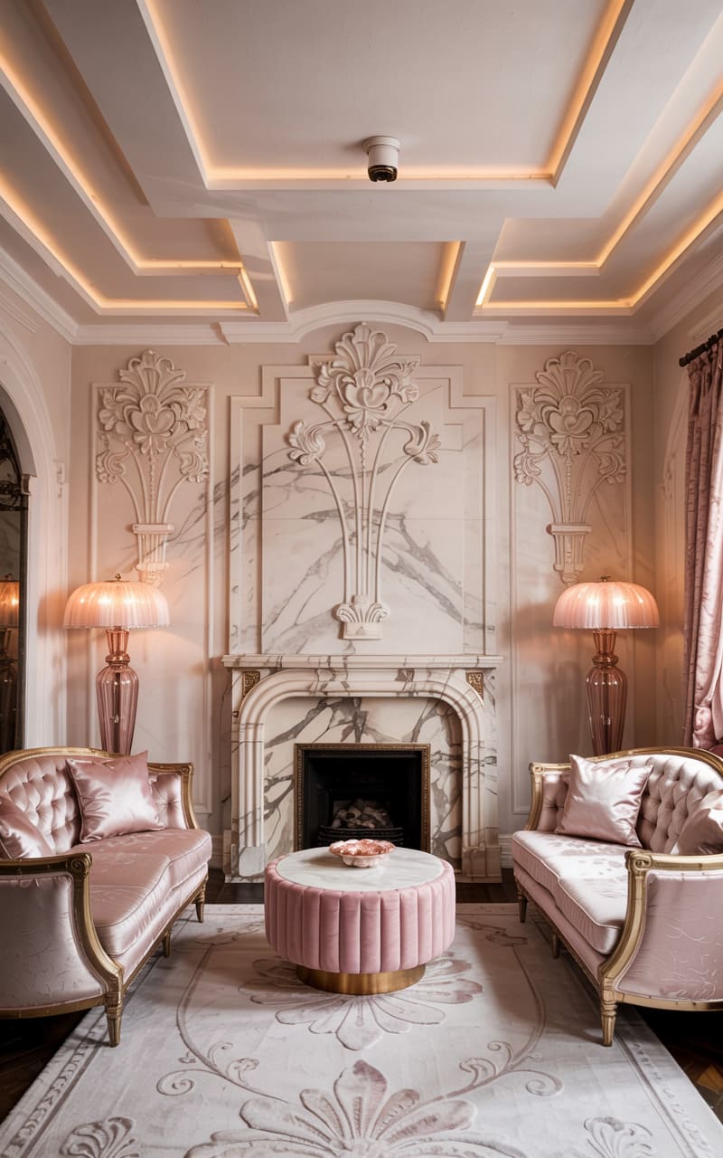Soft blush tones and creamy whites converge in this exquisitely feminine Art Deco sitting room, where elegance whispers from every corner. Intricate plasterwork adorns the walls and ceiling, framing a magnificent marble fireplace that serves as the room’s heart. Two settees, upholstered in lustrous pink satin and detailed with gold-leafed wood, face each other across a fluted pink ottoman. Delicate, shell-pink glass lamps cast a warm, inviting radiance. The plush, light-colored rug features a subtle fan motif, reinforcing the room’s delicate Art Deco sensibility and creating an atmosphere of serene, old-world charm.
