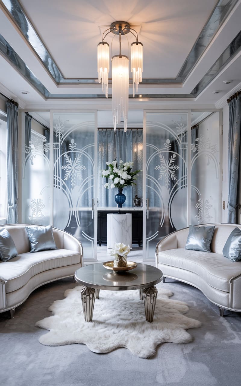 An ethereal, frosted ambiance defines this sophisticated Art Deco living room, where cool blues and silvers predominate. A stunning room divider, composed of glass panels etched with delicate snowflake and geometric motifs, separates the space with translucent elegance. Two gracefully curved white sofas, accented with silver-grey satin pillows, face each other across a sleek, metallic coffee table. A luxurious white fur rug adds a touch of tactile warmth. Overhead, a cascading glass chandelier refracts the light, enhancing the room’s icy, dreamlike quality and creating a serene, glamorous sanctuary.