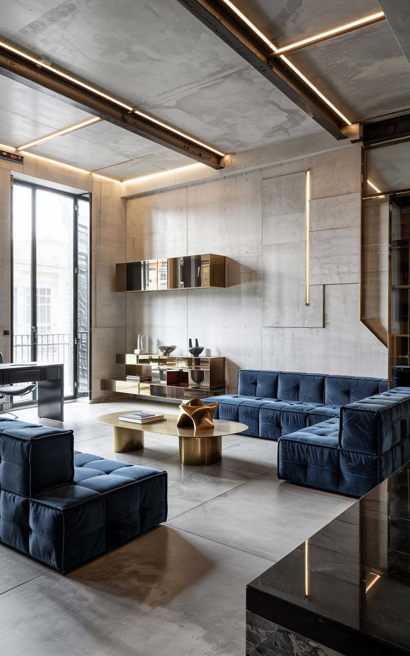 Industrial chic meets Art Deco refinement in this expansive living area, where raw concrete walls and exposed ceiling beams create a surprisingly harmonious backdrop. A sprawling, modular sofa upholstered in deep blue velvet provides ample, luxurious seating. Golden accents abound, from the sculptural coffee table and side tables to the sleek, minimalist shelving unit displaying curated objects. Linear LED lighting, both embedded in the ceiling and as a vertical wall feature, casts a contemporary glow, highlighting the contrast between rugged textures and polished, glamorous details, forging a unique, modern-Deco aesthetic.